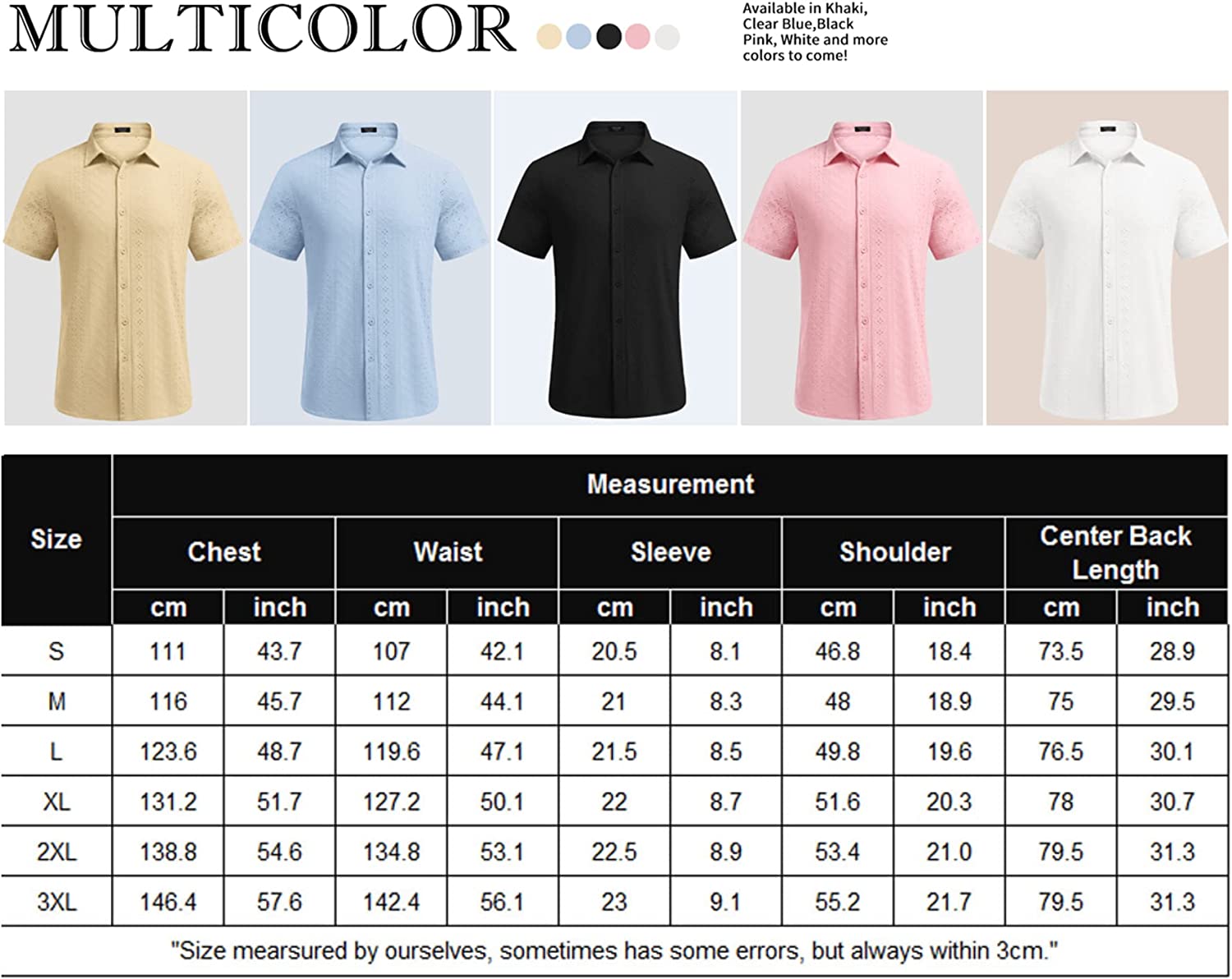 - STYLISH DESIGN - Men's Beach Shirts featuring Short Sleeve, Button Down Closure, Turn Down Collar, Solid Color, Hollow Out Geometric Design, Pattern Eyelet Embroidery. This men's summer shirts will become a unique highlight for your daily wear & vacation wear. It is a must-have shirts for men's wardrobe.