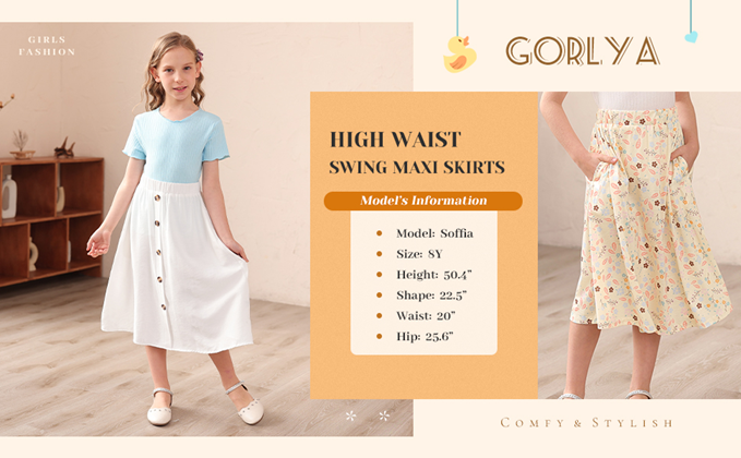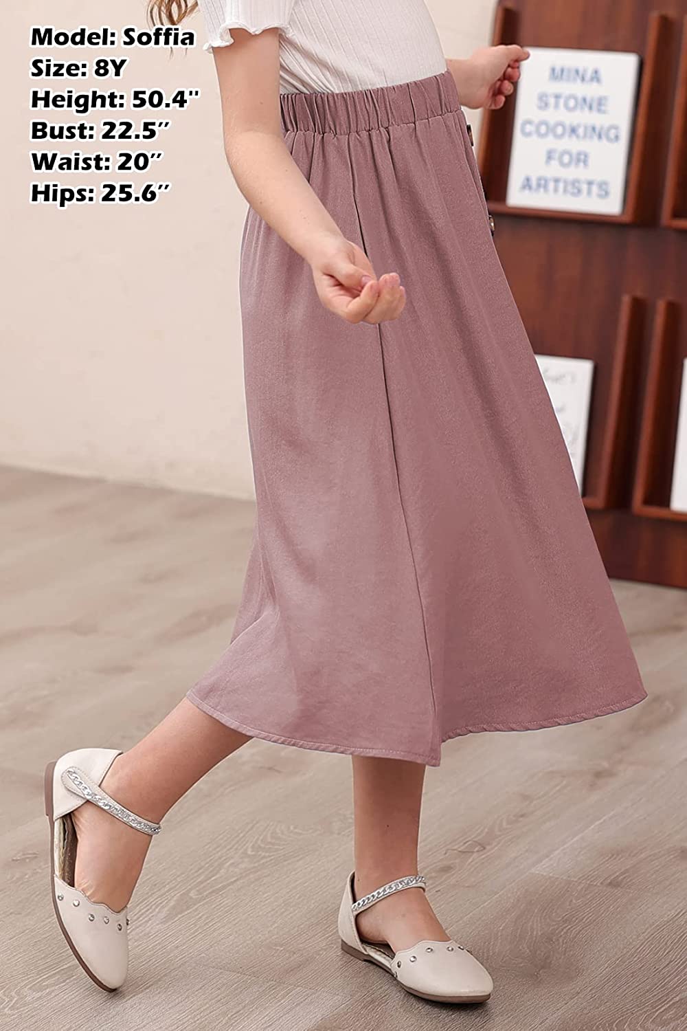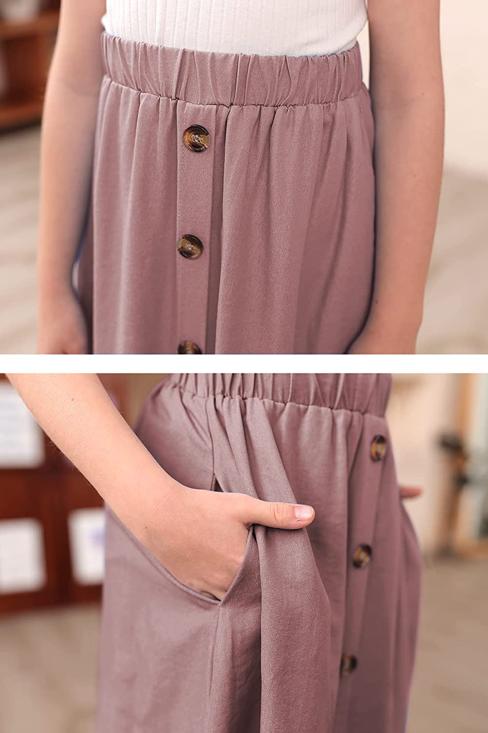 GORLYA Girls A-Line Elastic High Waist Pleated Swing Maxi Skirt with Pockets for 4-14T