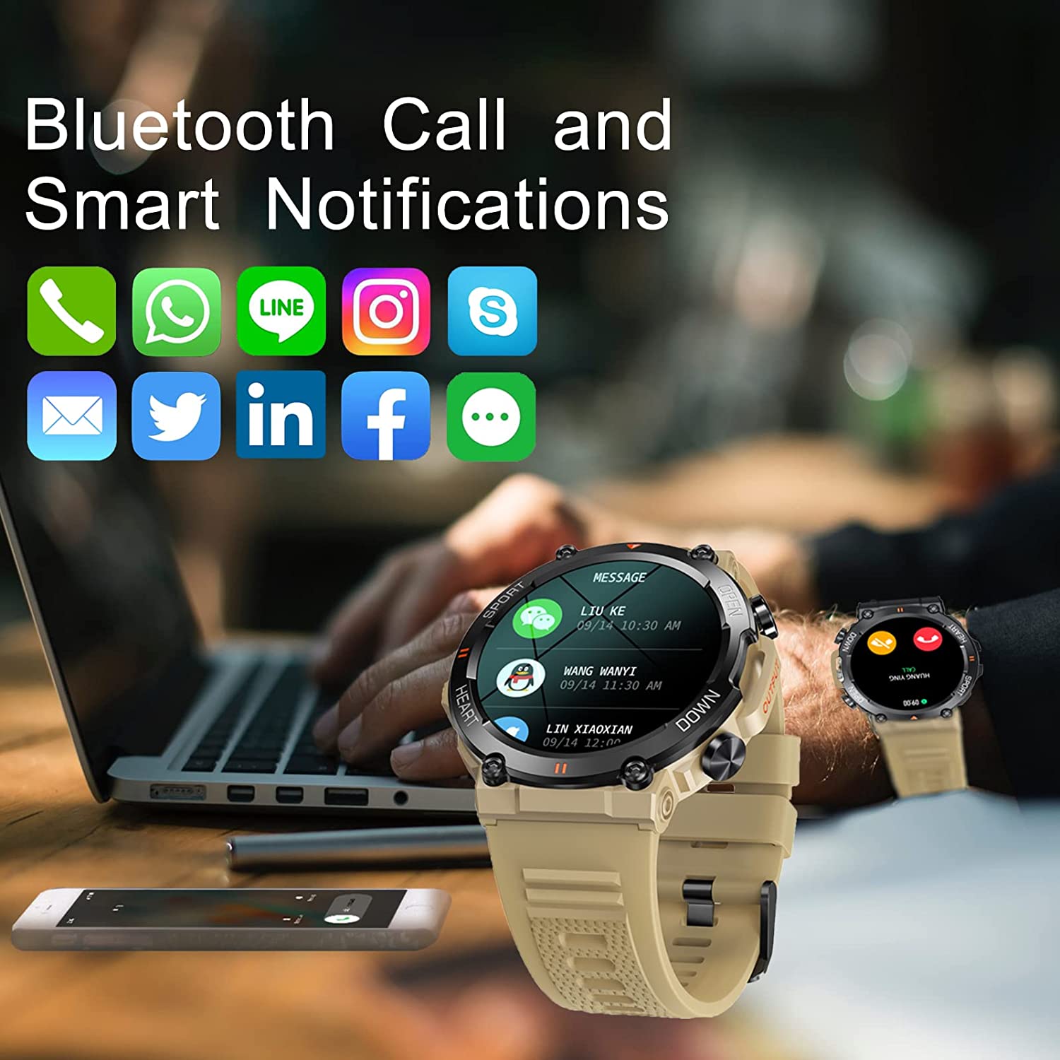 【Health monitoring, Bluetooth calling and message】-The military smart watch has a built-in sensitive motion sensor that can automatically monitor your real-time heart rate, sleep, blood pressure, and oxygen. It will vibrate to remind you when your heart rate is abnormal. When connected to an Android or iOS mobile phone, you can directly dial or answer calls on the watch's screen. You can also receive SMS and app messages, vibration alarms, which are useful when driving or exercising, ensuring you never miss important calls and messages.