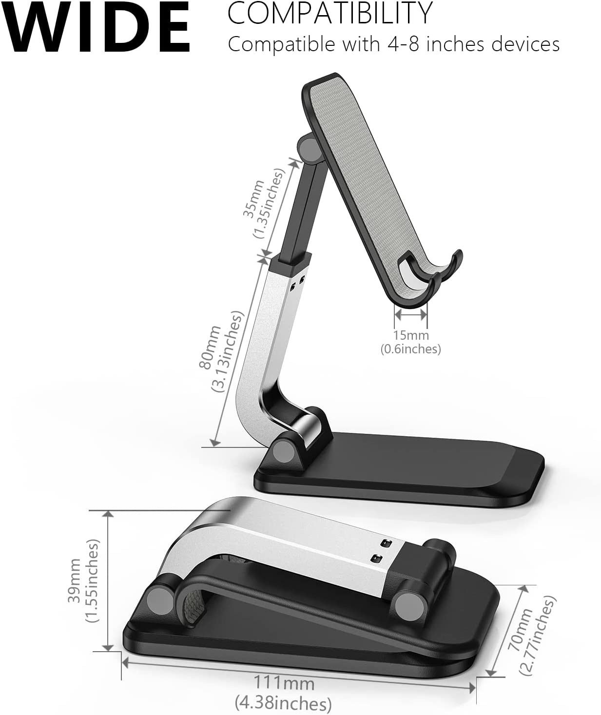 [Foldable and Useful] Lightweight, easy to use holds phone with or without case, holds your tablet also nonslip pad surface sleek look, foldable, and portable, you can easily put the cell phone holder in your bag and pocket. A perfect companion if you traveling, in the office, or at home