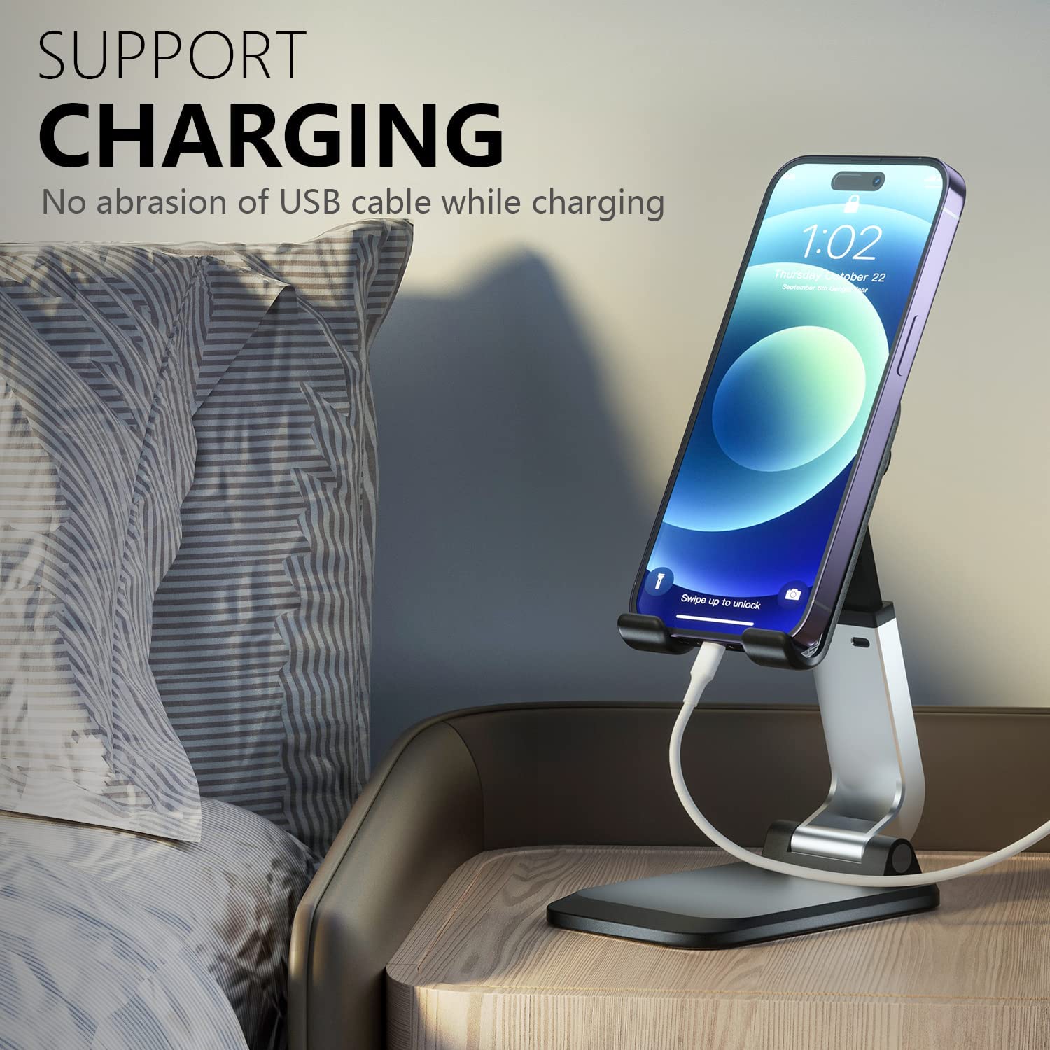 [Considerate Design] 2 Pack Phone Stand for desk. Compact and sturdy, this phone stands a reserved charging port so you can keep the charger plugged in while watching. Be your desk accessory. Suitable for many occasions. Make your life more convenient in the kitchen, dining table, nightstand, or office