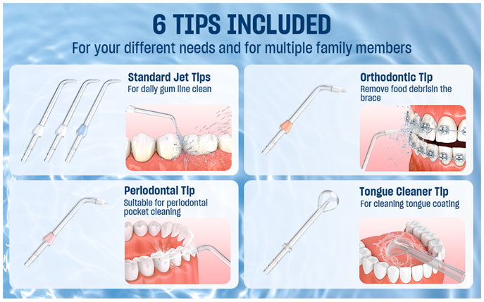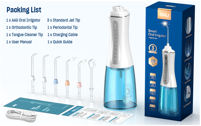 - WHAT YOU GET: 1 x AAU Oral Irrigator, 3 x Standard Jet Tip, 1 x Orthodontic Tip,1 x Periodontal Tip, 1xTongue Cleaner Tip, 1 x Charging Cable, 1xUser Manual, 1xQuick Guide.We provide 24hr Professional Customer Service. If you have any questions, please feel free to contact us.