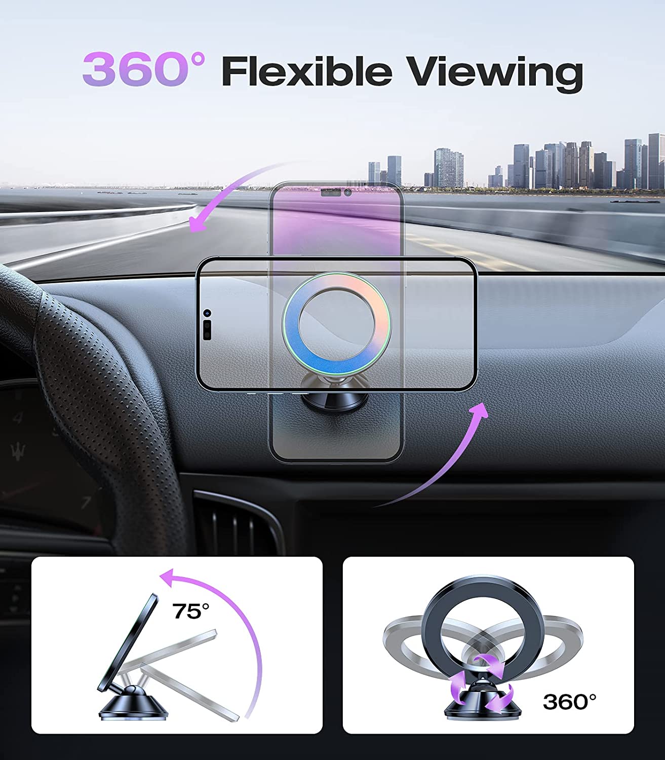 ?Small and 360° Flexible - As the lightest magnetic car cell phone holder on the market, you can install it anywhere. It doesn't take up space in your car or obstruct the view, easy adaptation into any car. The iphone magsafe car mount has a 360-degree omnidirectional adjustment ball joint, you can twist the magnetic ring panel to set the orientation of your phone arbitrarily, ensuring that your phone is always at the angle you like