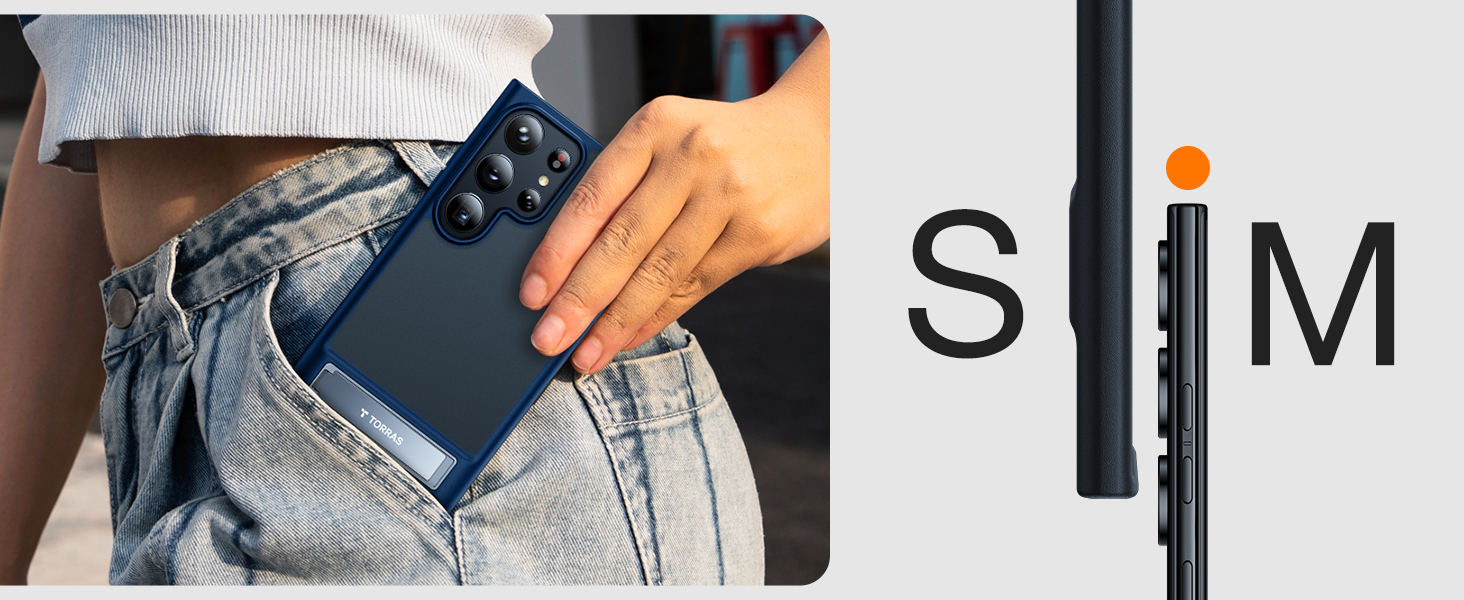 - [Stury Stand. Slim Figure] Made of Aerospace Aluminum, the durable kickstand is tested to be used more than 30,000 times. Folding up nearly flush with the back, the built-in stand makes the Galaxy S23 ultra case slim and easily slips in/out of your pocket. Say bye to the embarrassment of the phone bulging or stuck in your pocket