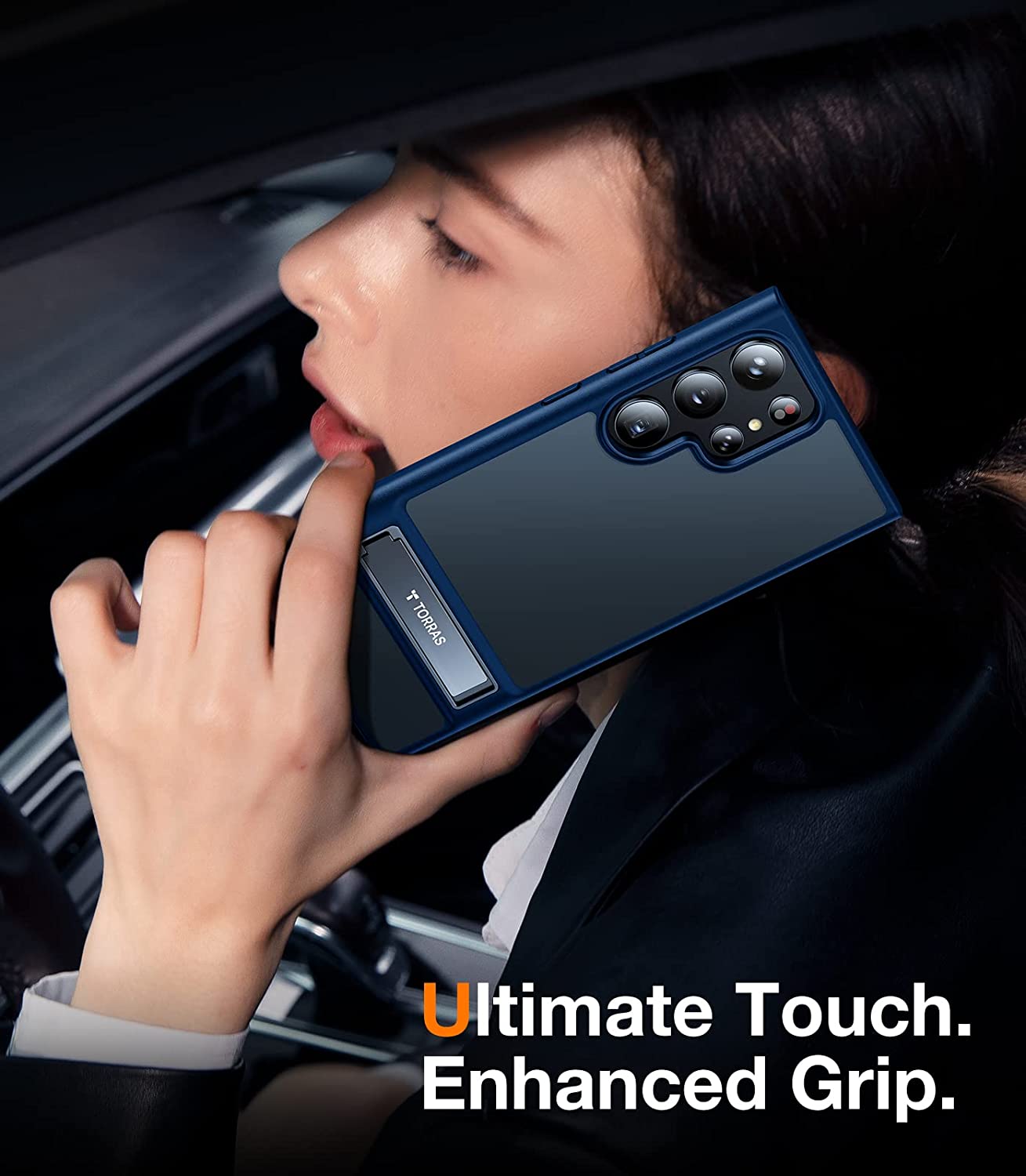 - [Mystic Look. Premium Touch] Designed with a business dark color that never fades, the translucent back brings your phone a sense of mystery and fashion. Adopting nano-oleophobic coating on the back and laser texture on the edge, the blue S23 ultra case with kickstand gives you an excellent comfortable touch and grip that you can't put down