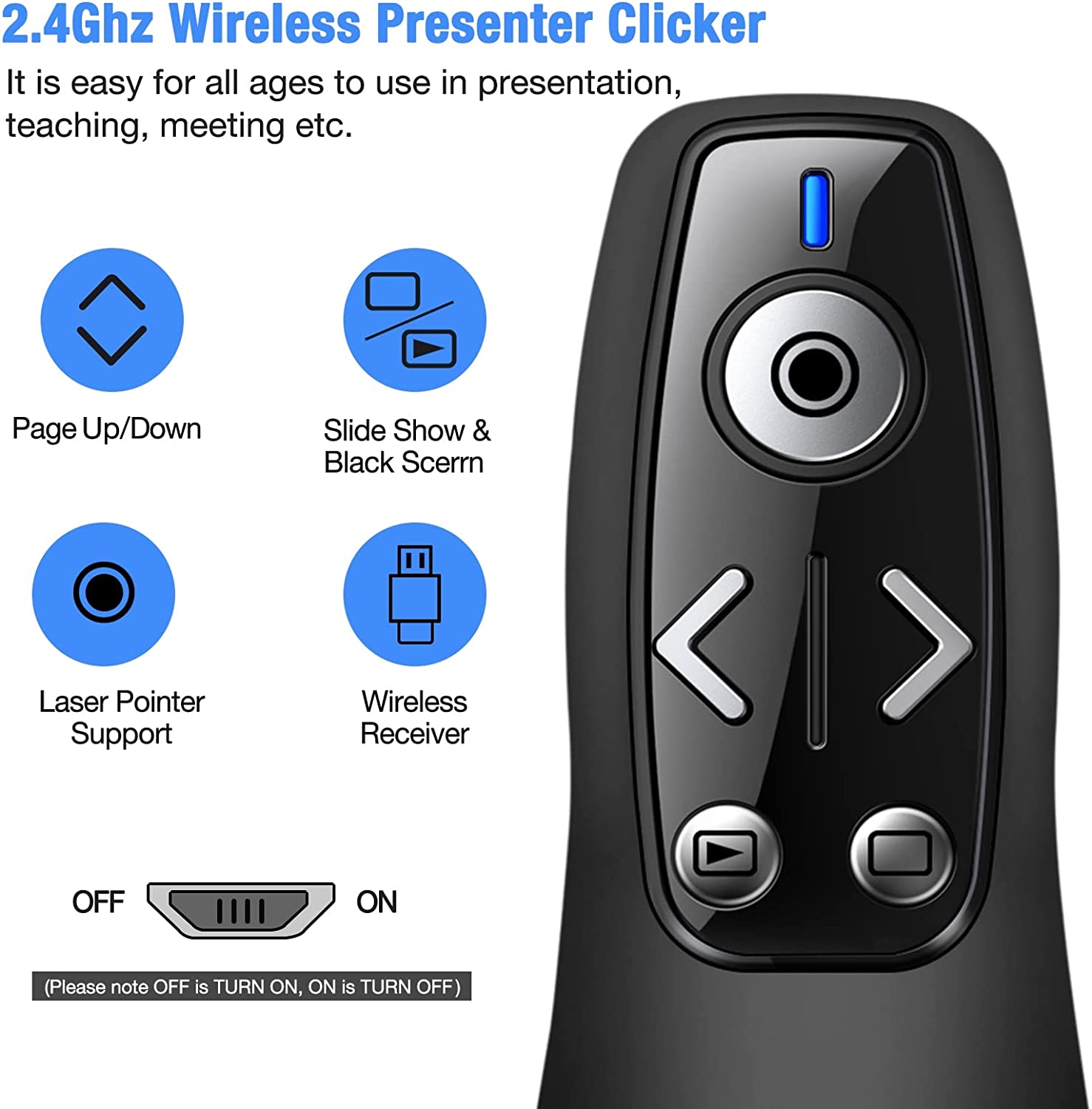 【LONG CONTROL RANGE OF THE CLICKER】With this pointer presenter remote, you have the freedom to come out from behind the computer or podium and connect with your audience. The powerpoint clicker also has a wireless control range of up to 100 feet, so you can make your lectures more interactive rather than just talking to your students from standing at your desk clicking buttons.