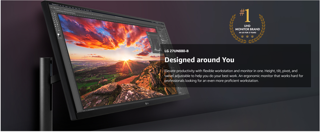 Elevate productivity with flexible workstation and monitor in one. Height, tilt, pivot, and swivel adjustable to help you do your best work. Turn to LG’s 27” UltraFine UHD IPS Display Ergo Monitor to edit photos, create content and design graphics at just the right height — whether sitting or standing. An ergonomic monitor that works hard for professionals looking for an even more proficient workstation, while still delivering an amazing UHD picture, breathtaking clarity, fine detail and accurate color.