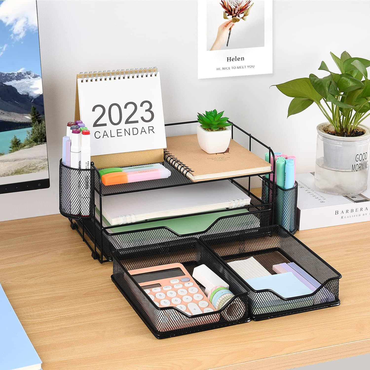 ? [Space Saving]: Desktop organizer provides you with sufficient classified storage space, and everything is within your reach, including post it notes, writing tools, staplers, etc. Use the least space for maximum effect, stay away from messy desks and keep in order.