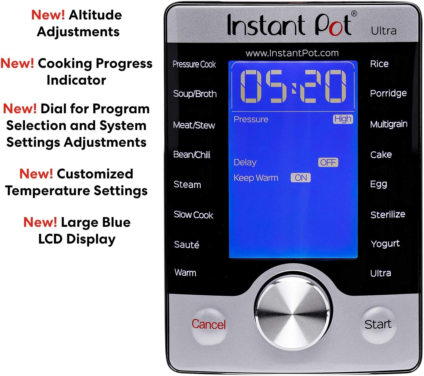 Instant Pot Ultra 10 In 1 Multi-Use Programmable Cooker is the next generation in kitchen appliances. Designed for the home chef looking for a greater degree of customization and control for even greater precision cooking. The Ultra combines the functions of a Pressure Cooker, Slow Cooker, Rice/Porridge Cooker, Cake Maker, Yogurt Maker, Saute/Searing, Steamer, Warmer, Sterilizer, and, a truly new and unique feature, the ultra-program. The 'Ultra' provides complete custom programming for pressure and non-pressure cooking. Now, one can set the exact parameters desired to achieve perfect results each and every time. With the 'Altitude' adjustment, the guesswork is eliminated from a recipe conversion providing a more precise cooking time. Designed with a large, blue LCD display with a 'Cooking Indicator' to provide one a clear visual on the progress of your dish from preheating, cooking, and Keep Warm. A central dial with a simple turn and press provides added precision in program selection and adjustments. And, the new - 'Steam Release Reset Button' ensures the safer handling of the steam release after cooking is completed. Built with 16 smart programs: Soup/Broth, Meat/Stew, Bean/Chili, Cake, Egg, Slow Cook, Saute/Searing, Rice, Multigrain, Porridge, Steam, Sterilize, Yogurt, Warm, Pressure Cook, and Ultra. Now, your favorite dishes are as simple as selecting your preferences and having them ready up to 70% faster. With the 'Sterilize' program one can pasteurize dairy products, sterilize baby bottles, jars, and utensils; As well as, perform certain types of canning much more conveniently than ever before The 'Cake Maker' is designed to prepare soft and moist cakes and the 'Egg' prepares perfect eggs in just a few minutes. America's most trusted brand has moved into a category of its own with the Instant Pot Ultra Delay Start time - Up to 24 hours.How It Works:The microprocessor carefully runs lab-tested algorithms to control the time, cooking pressure and temperature to ensure consistent cooking results. Users can customize these settings to control pressure level, adjust cooking time and a cancel button, allowing one to achieve their preferred cooking results. For instance, the “meat/stew” key is programmed to prepare perfectly tender, thoroughly heated meat dishes; however, users can attain fall-off-the-bone results by adjusting the cooking time.The fully sealed environment traps the flavors, nutrients, and aromas of the food instead of releasing them throughout the home. During pressure-cooking, heat is distributed evenly, deeply and quickly once pressure is built. In addition, minimal water is required for steaming so vitamins and minerals are not leached or dissolved. As a result, greens retain their bright colors and phytonutrients, meats and bones are thoroughly cooked yet tender, and whole grains and beans are soft and delicious, all with remarkable consistency.Designed to cater to varying tastes and food conditions, Ultra has adjustable settings to achieve one’s desired cooking results; 3 temperatures in ‘Sauté’ for searing, simmering or thickening for a maximum time of 30 minutes, and 3 temperatures in ‘Slow Cook’ to complete the tasks of a common slow cooker, ‘Keep Warm’, and 3 temperatures in ‘Warm’ to preheat food.The 24-hour delay start allows users to postpone the cooking start to have dinner ready when you are. Automatic ‘Keep Warm’ holds the temperature of the meal until you are ready to serve. With the ultra, one can easily turn the ‘Keep Warm’ function on/off. Power supply: 120V – 60Hz.