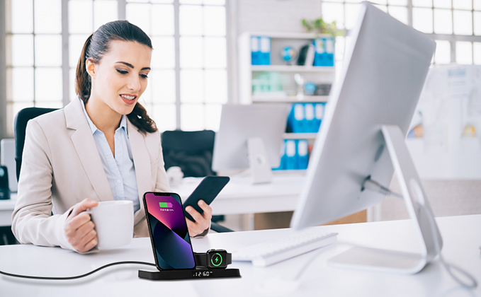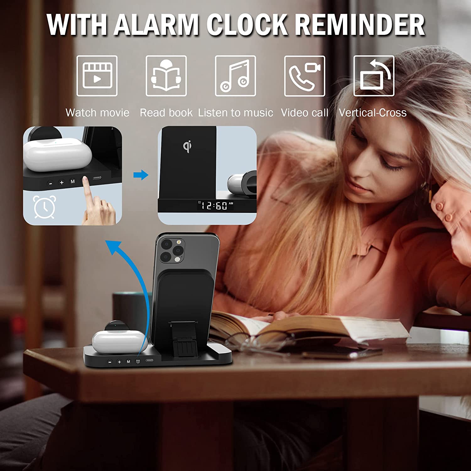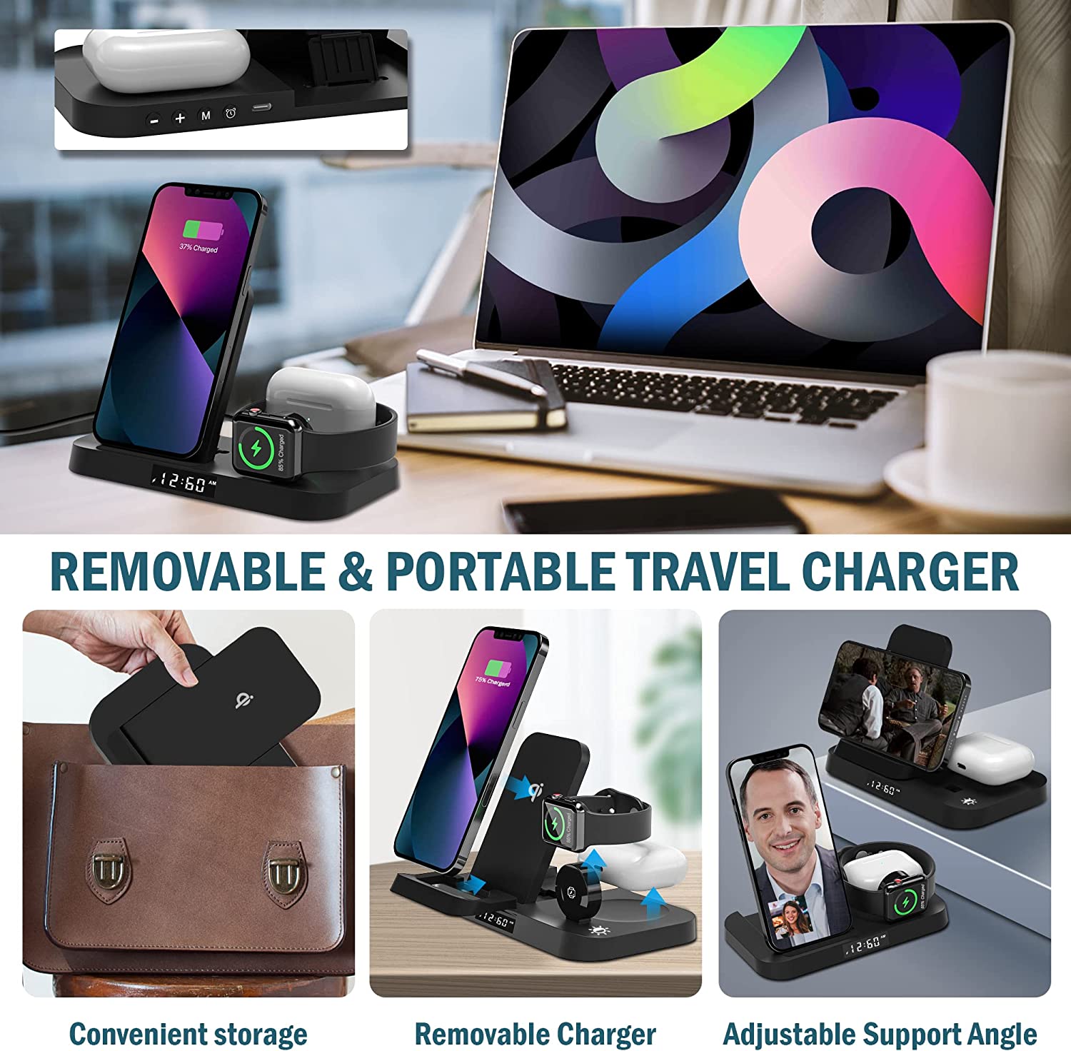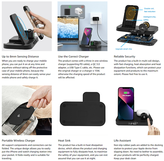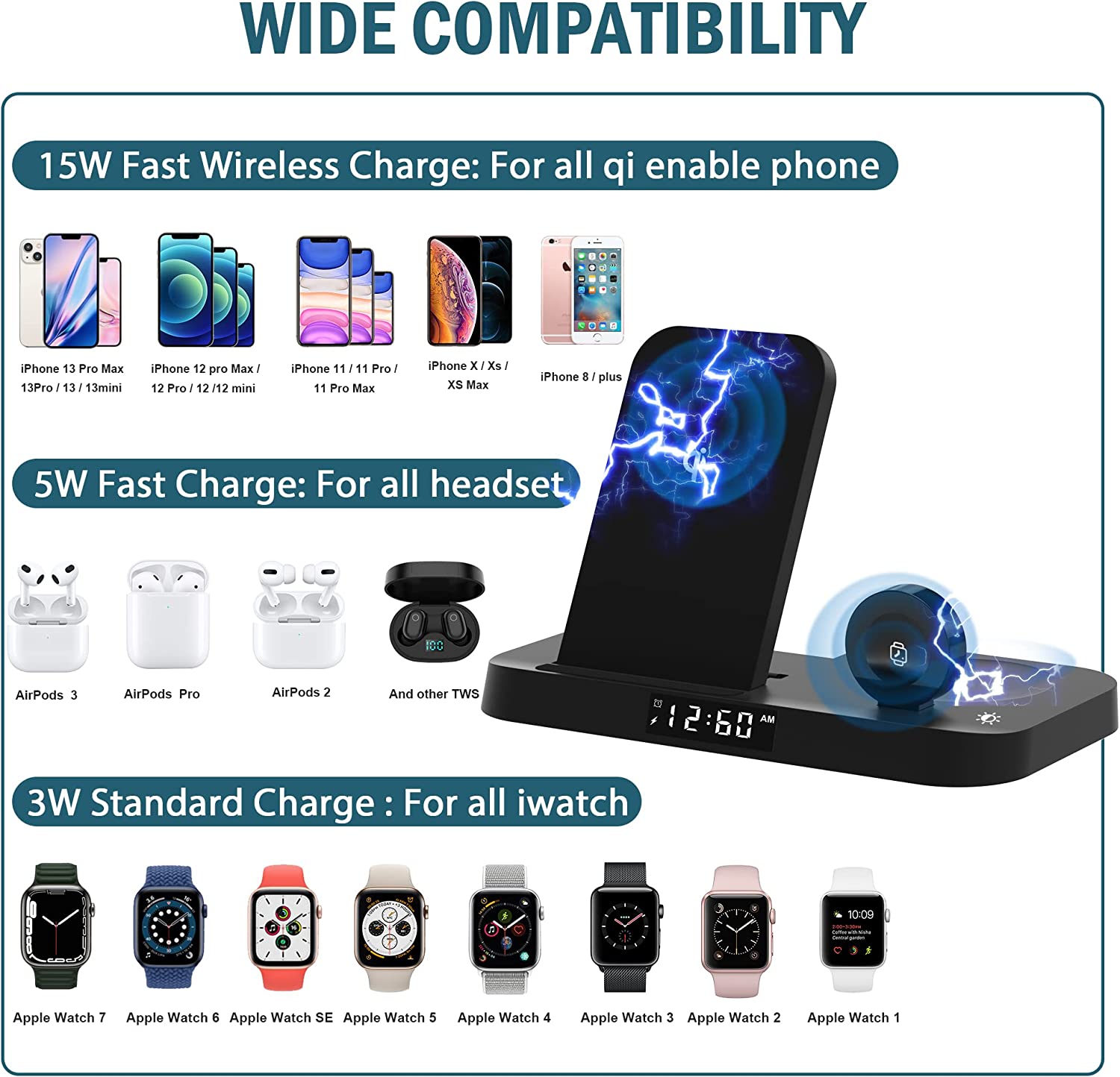 • 3-in-1 fast wireless charger: an integrated charging station for multiple devices. The charging station is compatible with Apple Watch+AirPods+iPhone. The 3-in-1 charging station can be one Apple watch charging station, one mobile phone charging station and one AirPods charging station, and is compatible with 99% of mobile phones that support wireless charging.