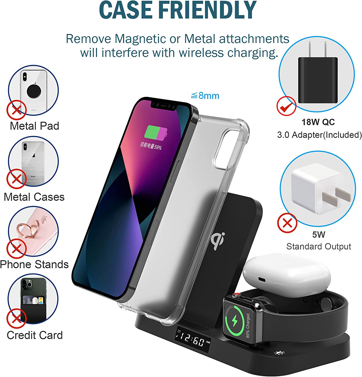 • Phone Case Friendly: The dual angle-adjustable feature must surprised you. The phone support part can be adjusted and fixed at any angle range from 0 to 135°. Therefore, the iPhone and Apple watch charging station is suitable for any iPhone model with different thickness case ≤8mm(even with popsocket). Whether the phone case is removed during charging is no longer a question for you.