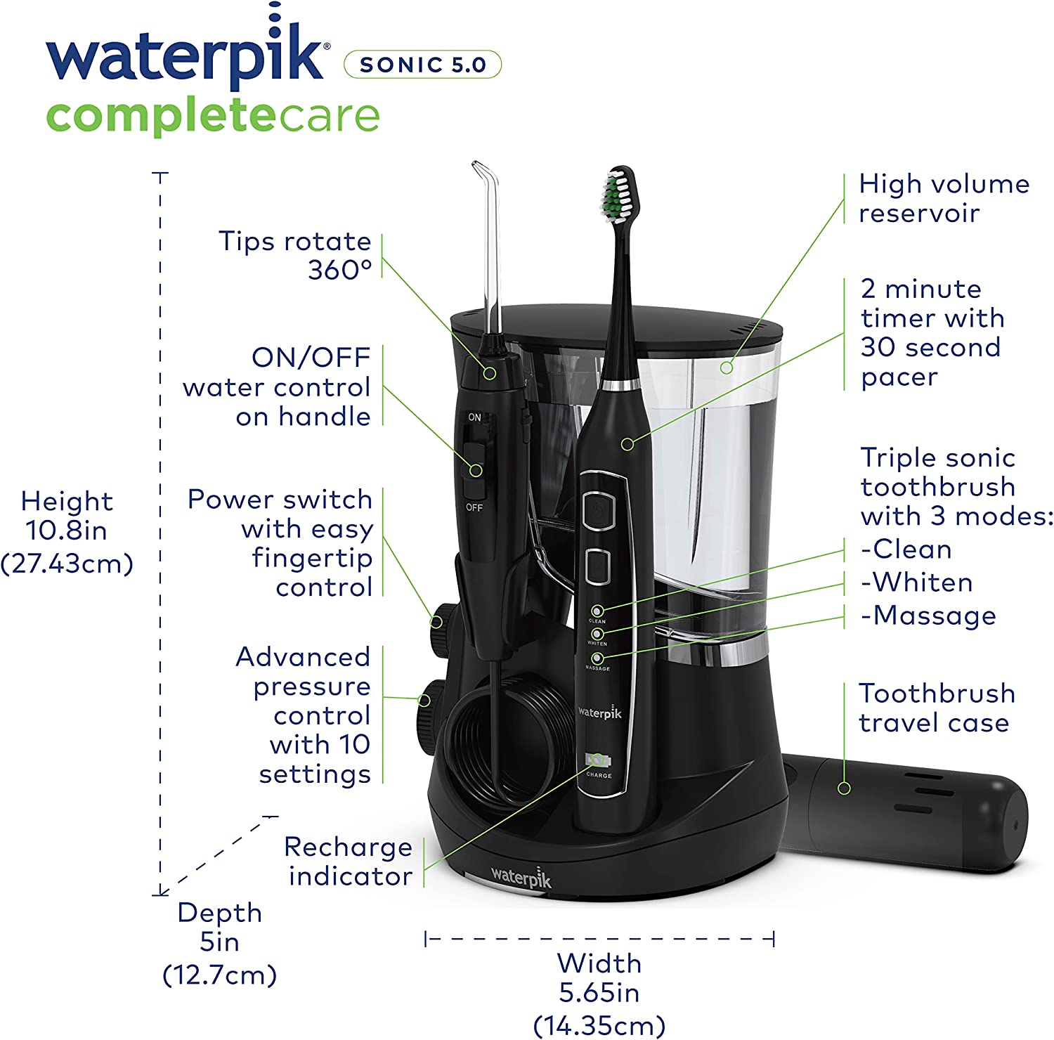 The Waterpik Complete Care 5.0 Water Flosser + Sonic Toothbrush WP-862 combines water flosser and sonic electric toothbrush technologies to create a perfect daily oral care routine. Now you can brush and floss with one convenient device that saves counter space and power outlets. And it's ideal for anyone with braces, implants, crowns, bridges, or other dental work. Complete with 10 pressure settings for low to high power, 5 water flossing tips, 2 brush heads, and the rechargeable Triple Sonic toothbrush, the Complete Care 5.0 is the ideal combination for all of your brushing and flossing needs.