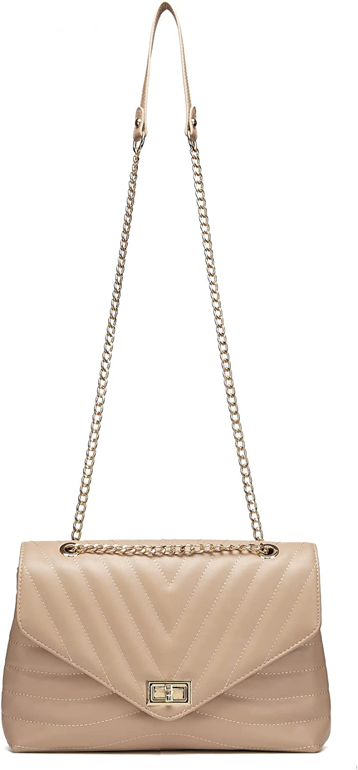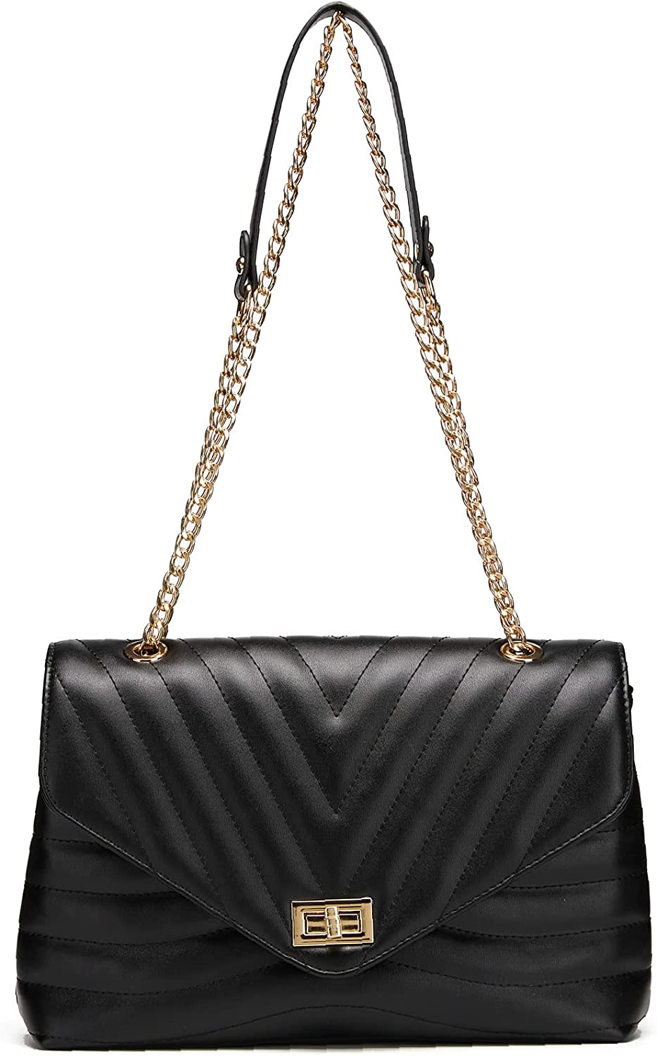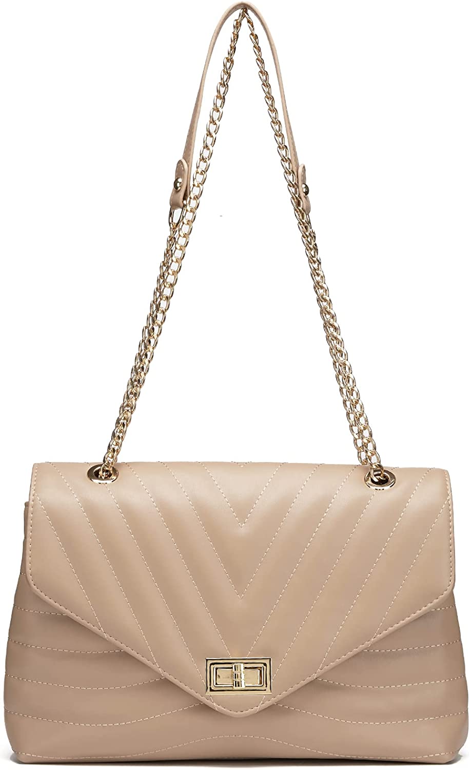 • CONVENIENT DESIGN: Lightweight handbag with adjustable chain straps. The strap of the quilted purse is composed of a light gold chain and soft leather, metal chain doesn't add too much weight. It can be a shoulder bag or a cross body or woman handbag or satchel bag, plus it also has a top handle, stand upright body is not easy to be out of shape.