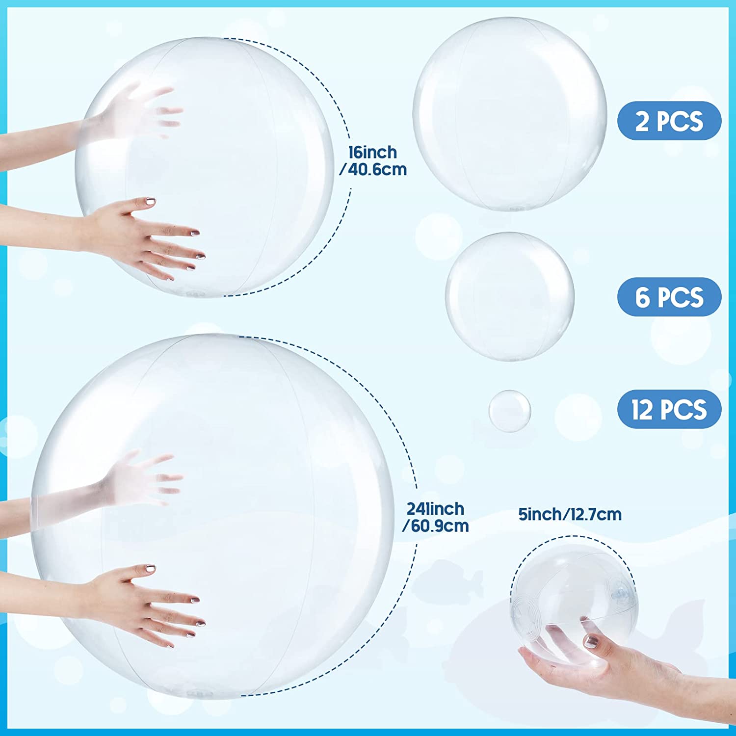 Multiple Sizes: the package contains 20 pieces of inflatable clear balls in 3 different sizes, including 2 pieces of 24 inches, 6 pieces of 16 inches and 12 pieces 5 inches, sufficient quantity and diverse sizes to meet your various needs for entertainment or decoration