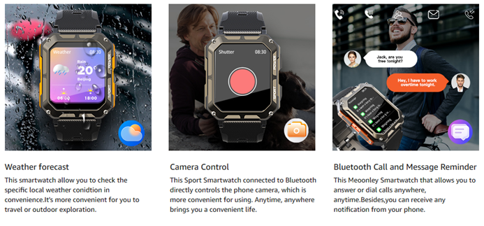- 【More Function wait for Your Exploration】This Meoonley has more other function.Including calculator function and weather function.After you connect the smartwatch via bluetooth.It will display the Local weather. Moreover, it has weather, alarm clock, remote camera, sedentary reminder, stopwatch functions.
