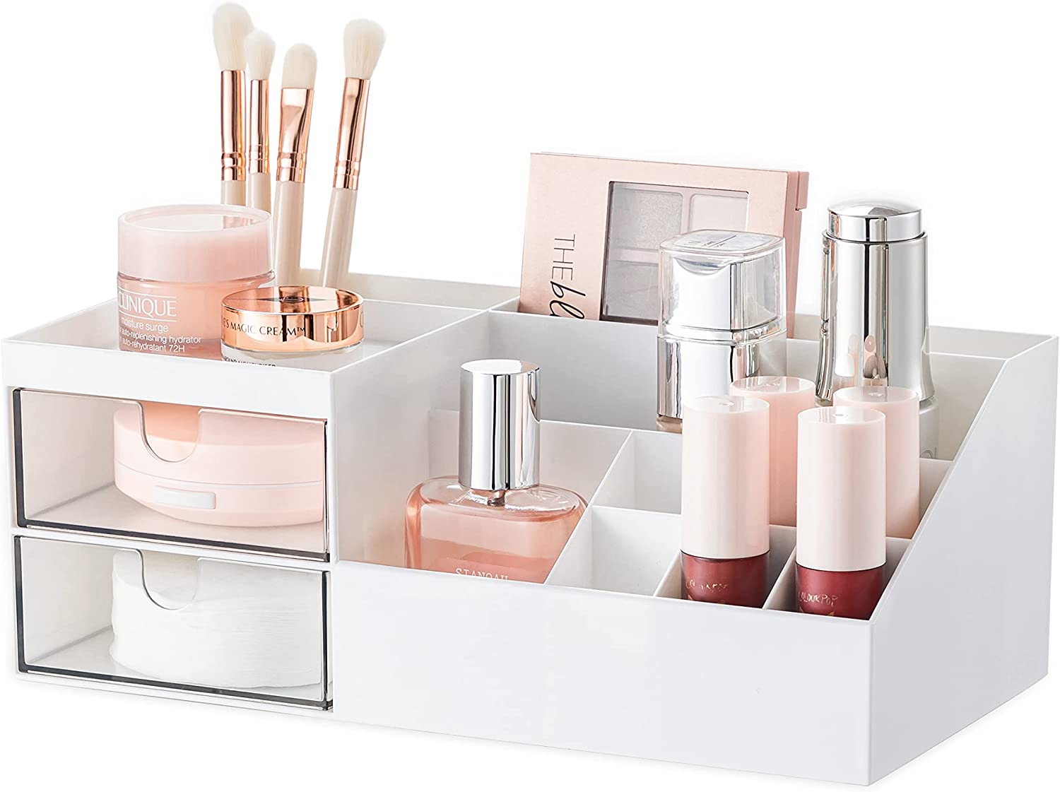 LARGE CAPACITY - The HBlife makeup organizer and storage has 11 compartments, which can store makeup palettes, eyeshadows, powders, nail polish, lotions, perfumes, makeup brushes, and other bathroom or office supplies.