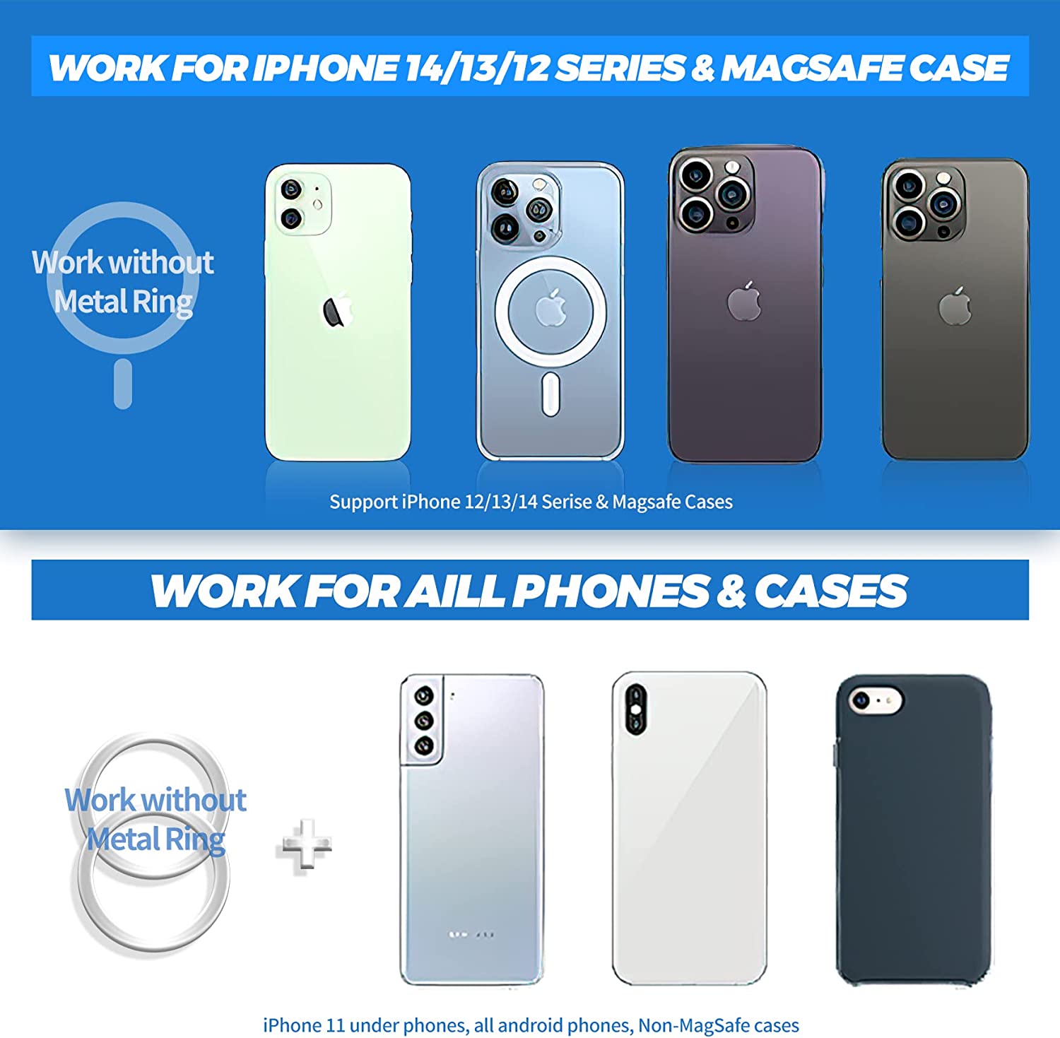 【Magsafe Design】This Tesla MagSafe Car Mount is Compatible With iPhone 14/13/12 Pro Max Mini and Official MagSafe Cases and Other Magnet Phone Cases. (Note: If Your iPhone 12/13/14 Has a Thick Case or If You use Another iPhone or Android Phone, Please Attach The Metal Ring to The Back of Your Phone or Case.)