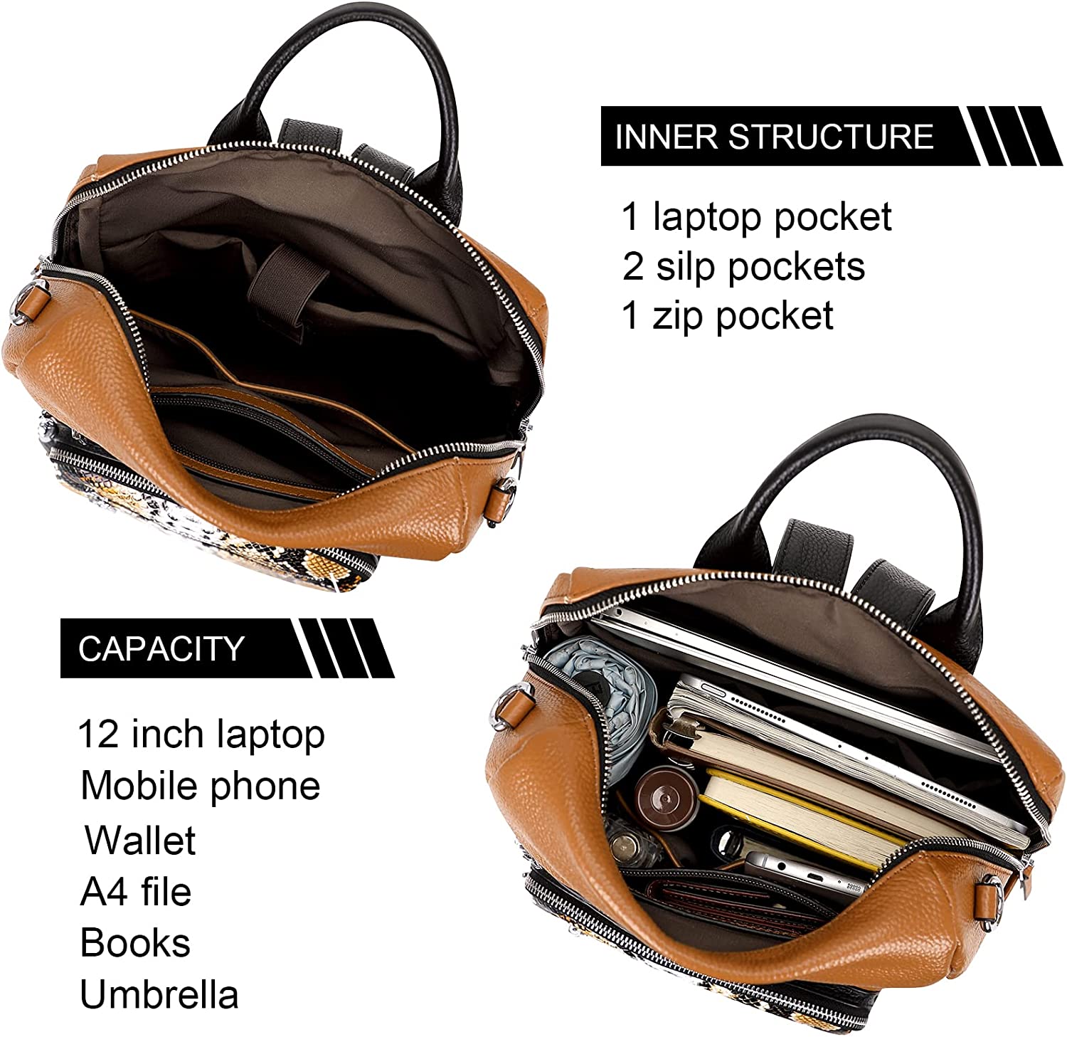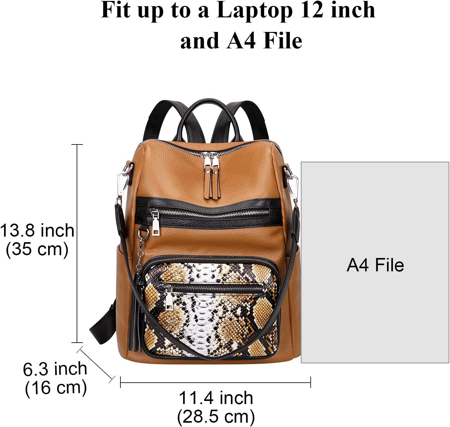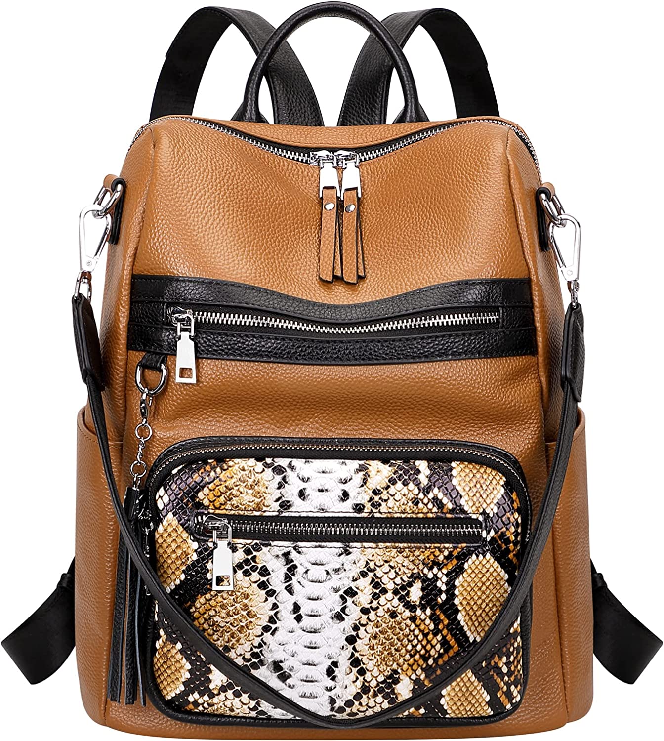 ALTOSY Genuine Leather Backpack Purse for Women Large Shoulder Bag With Laptop Compartment Multiple Pockets (S106 Yellow Brown/Black/Y-Brown Python)