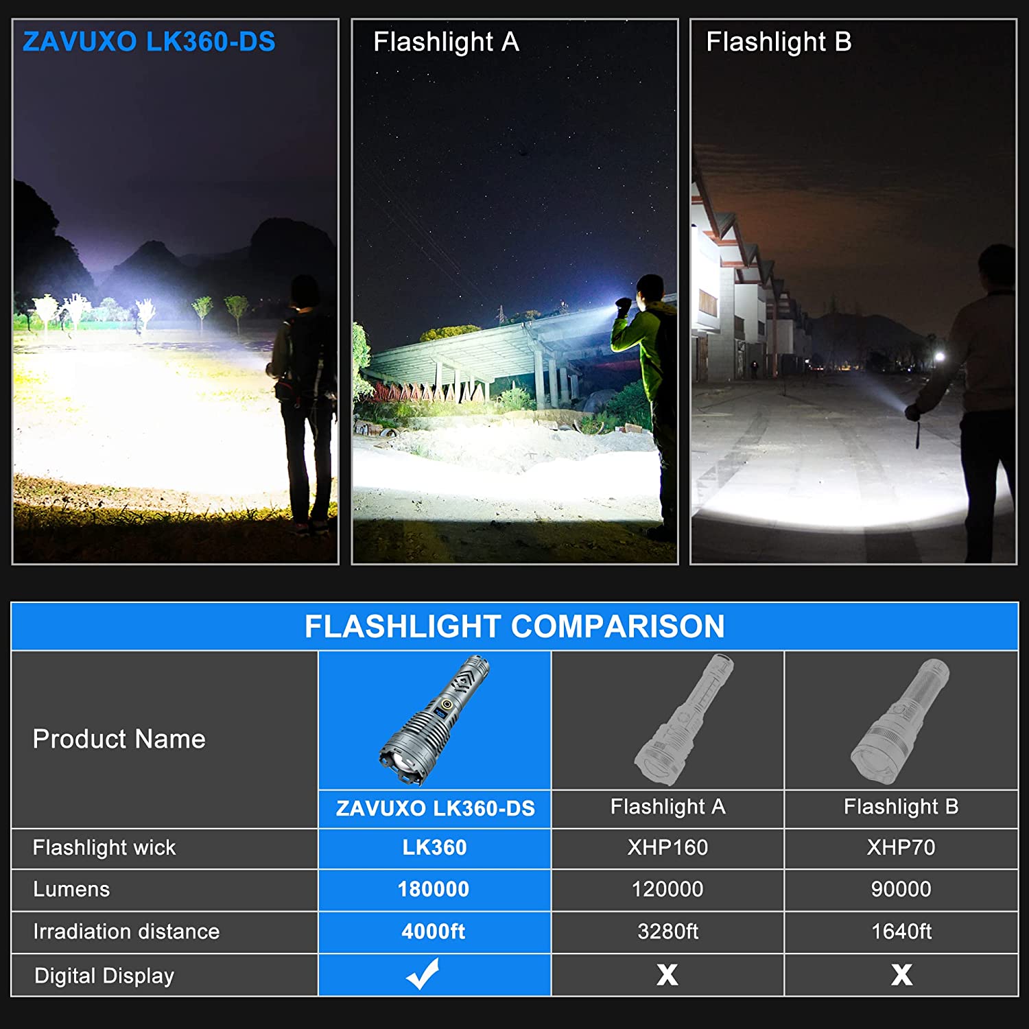 ?【180000 LUMENS SUPER BRIGHT RECHARGEABLE FLASHLIGHT】LK360-DS rechargeable LED flashlights has a built-in LK360 upgrade chip, and it has a multi-functional protection board to prevent overcharging, overheating, overvoltage and short circuit, thus prolonging the life of the super bright flashlight. LK360-DS high lumens flashlight can produce a super high output of 180,000 lumens, and the maximum illumination distance can reach 4,000 feet. 30 times brighter than ordinary LED flashlights!