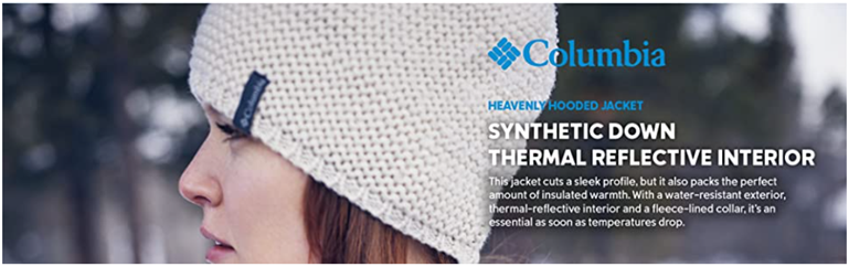 • Columbia Women's Heavenly Hooded Jacket features Omni-Heat Reflective technology, a 100% polyester synthetic down lining, and handy features to keep you cozy and protected during weather-heavy days.