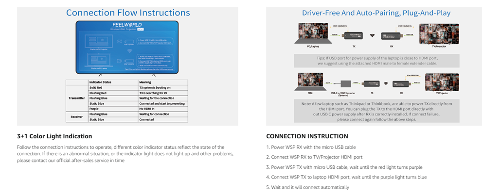 - High compatibility, end-to-end signal transmission: FEELWORLD mini wireless HDMI extender kit work with most HDMI equipped devices such as TV box, camera, DVD,Laptop,Devices without HDMI interface can also use the transmitter via