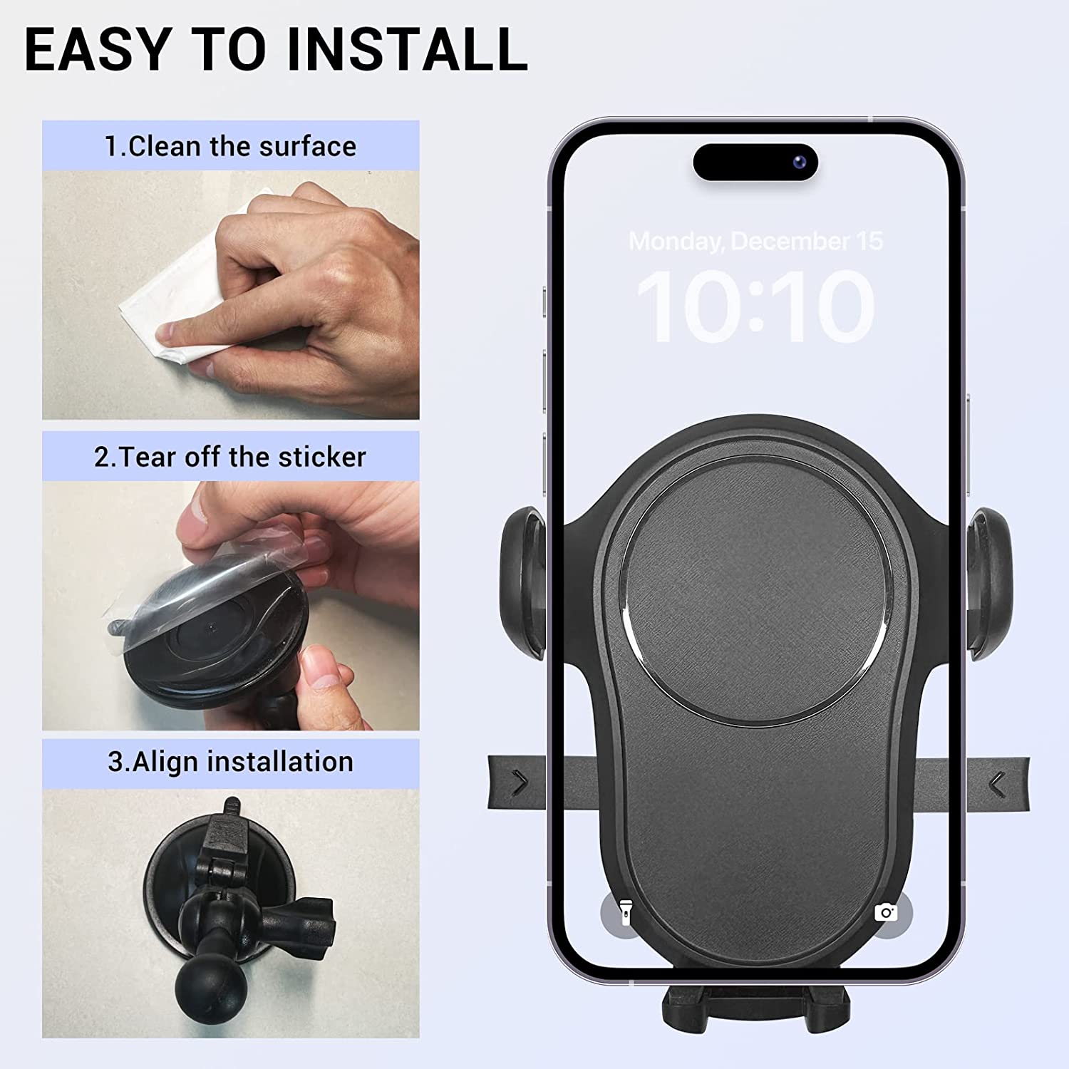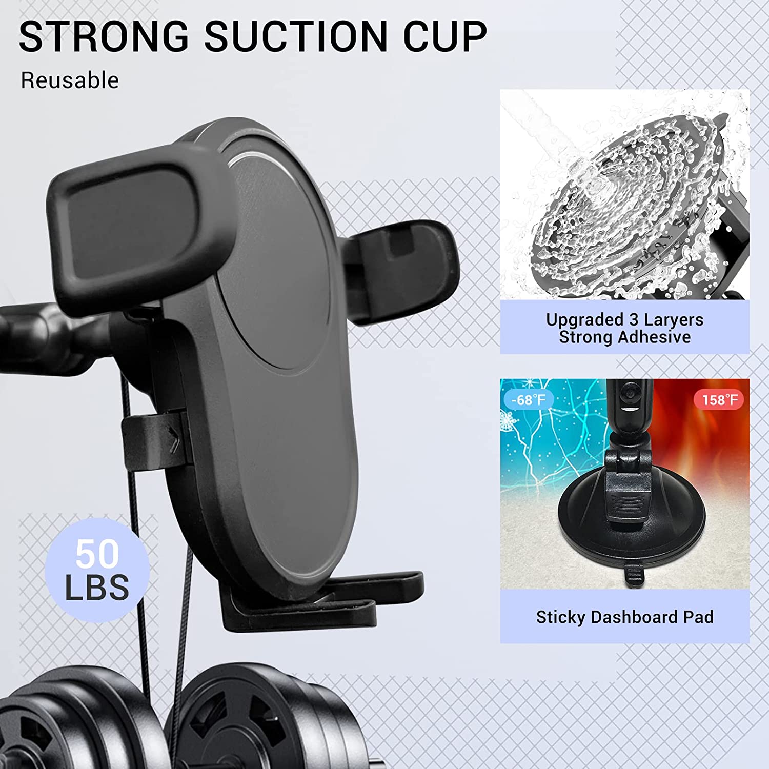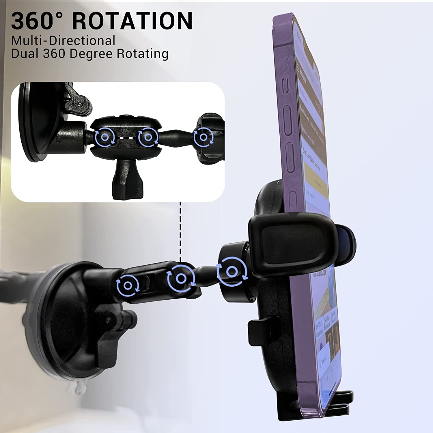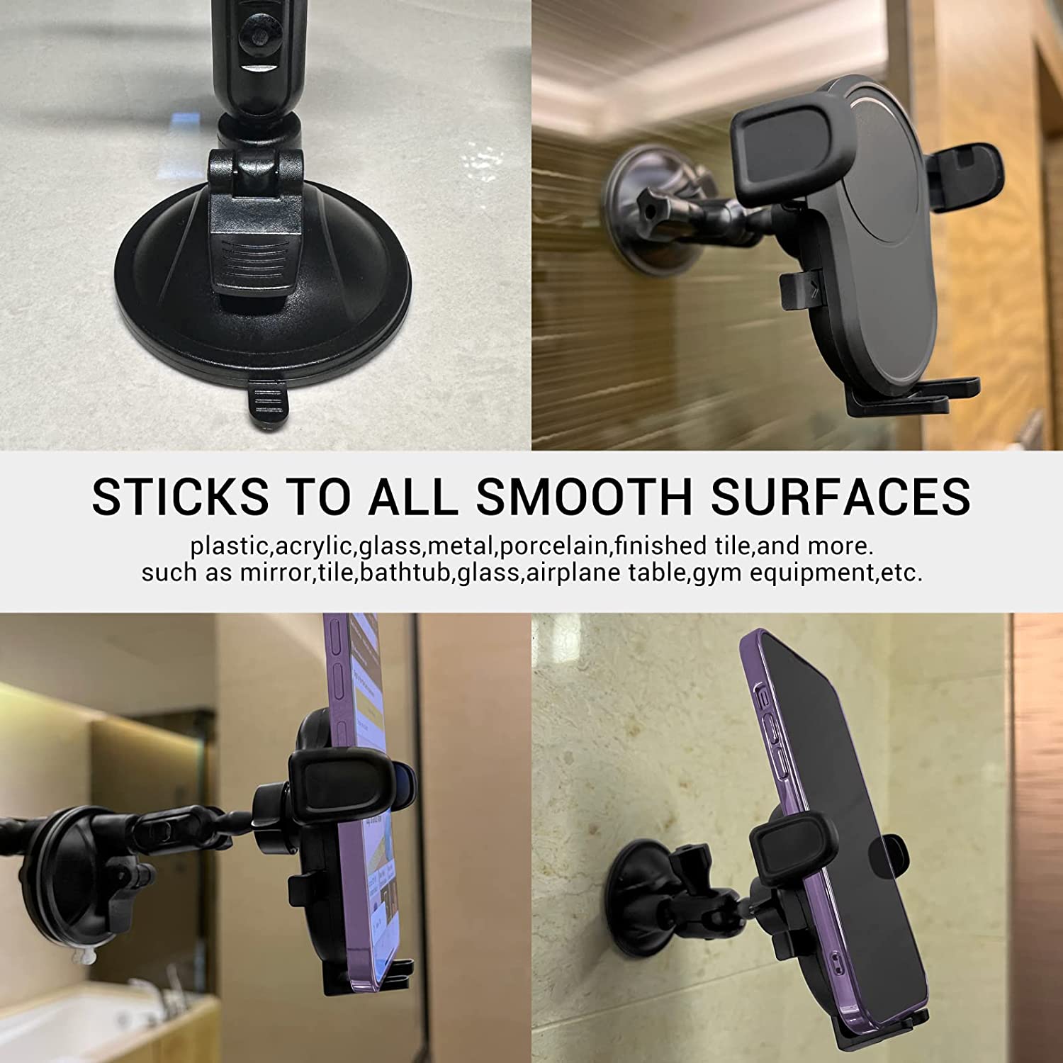 【Reliable & Secure】The powerful suction cup phone mount can mount your phone to any smooth wall or surface, such as mirror, tile, bathtub, glass, airplane table, gym equipment,Dashboard,Windshield etc.