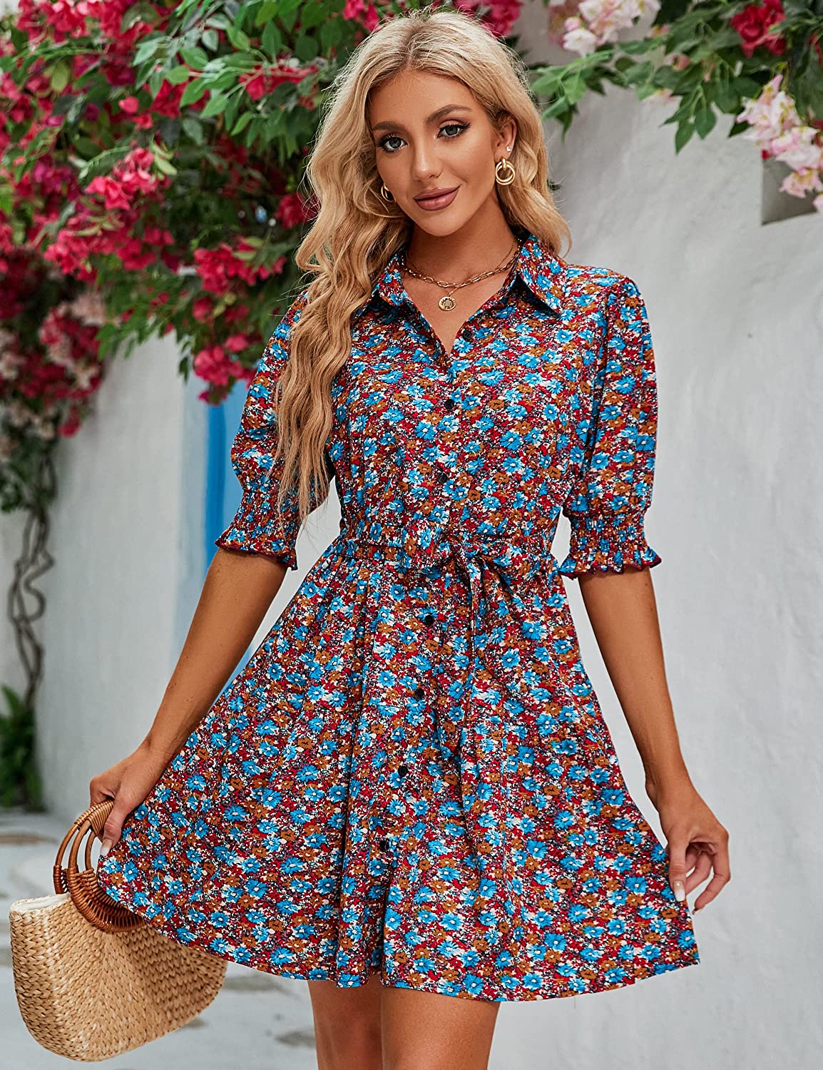 Design: The cute dresses for women flatter most body shapes and hide belly well thanks to elastic smocked bodice and a line design. Sexy open back with adjustable self-tie bowknot shows your beautiful back while having a comfortable feeling of wearing. The vibrant floral leopard print creates vivid bohemian vibe.