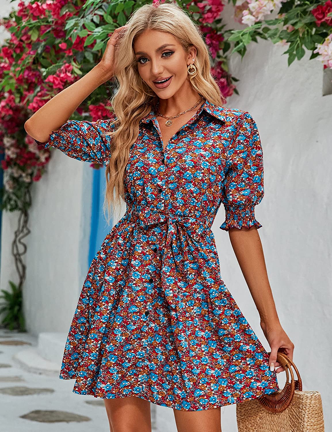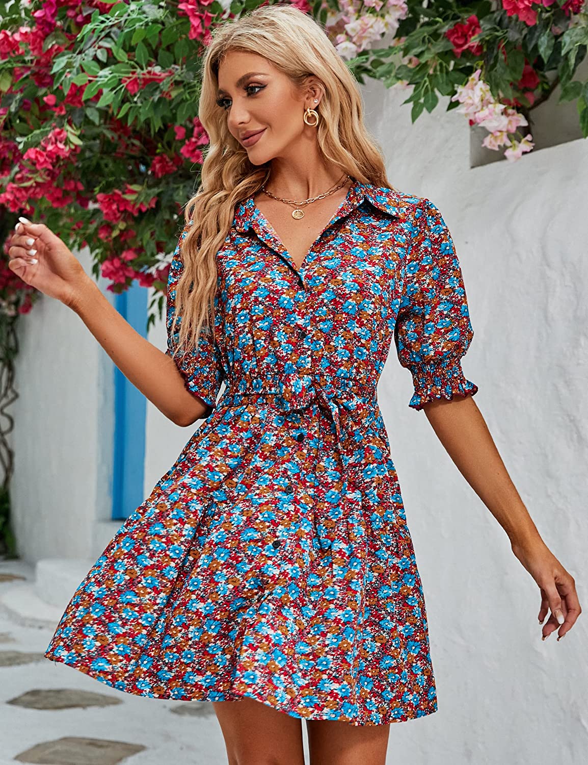 Feature: Womens summer dresses feature square neck, puff short sleeve with elastic cuffs which also can be sexy off shoulder, stretchy smocked bust design, elastic empire waist with cute ruffle, tie open back, 2 pockets, floral print, above knee length, a line baby doll silhouette, releaxed fit.