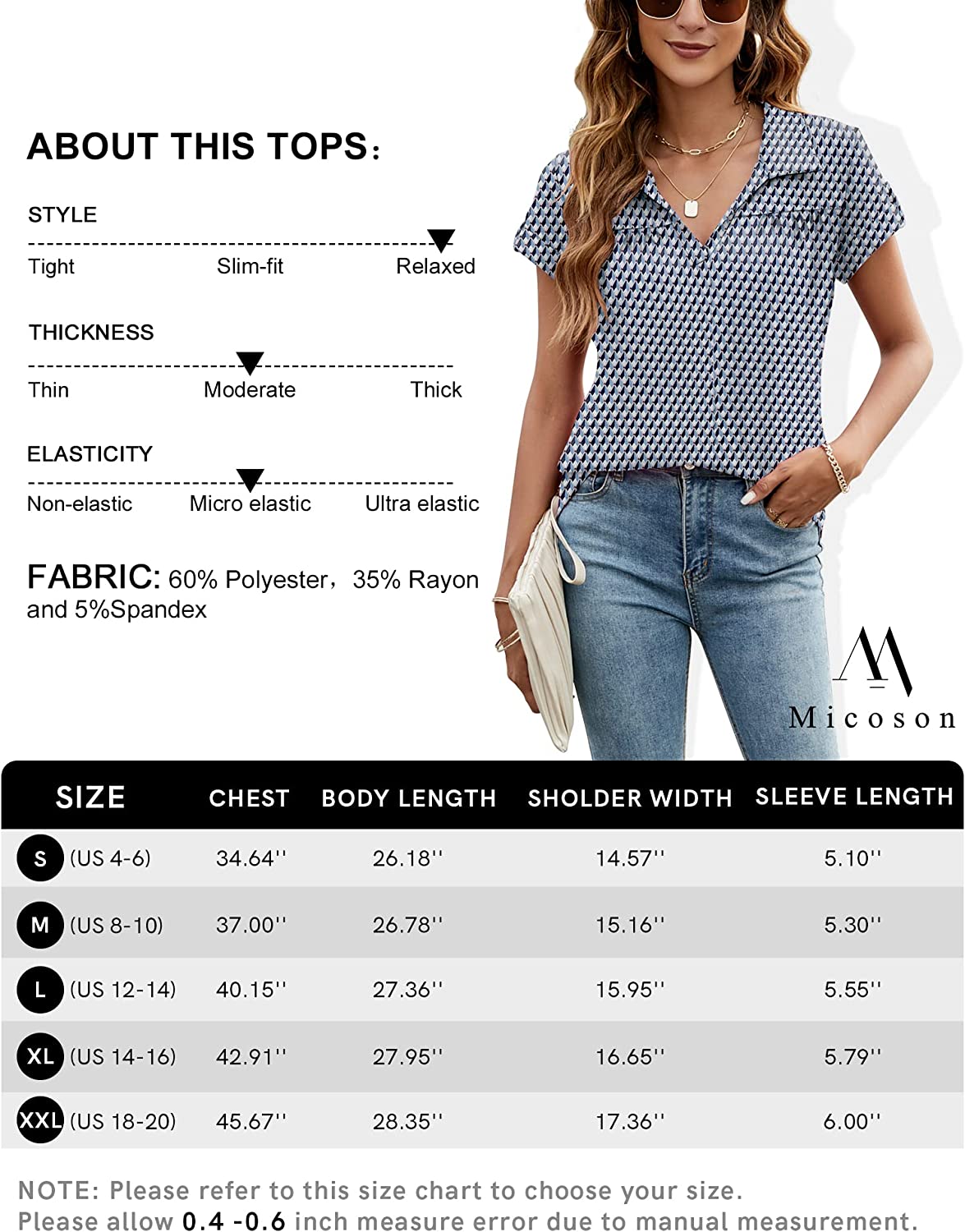 Micoson Womens Polo Shirts V Neck Short Sleeve Collared Tops Pleated T Shirts Casual Tunic Blouse S-XXL