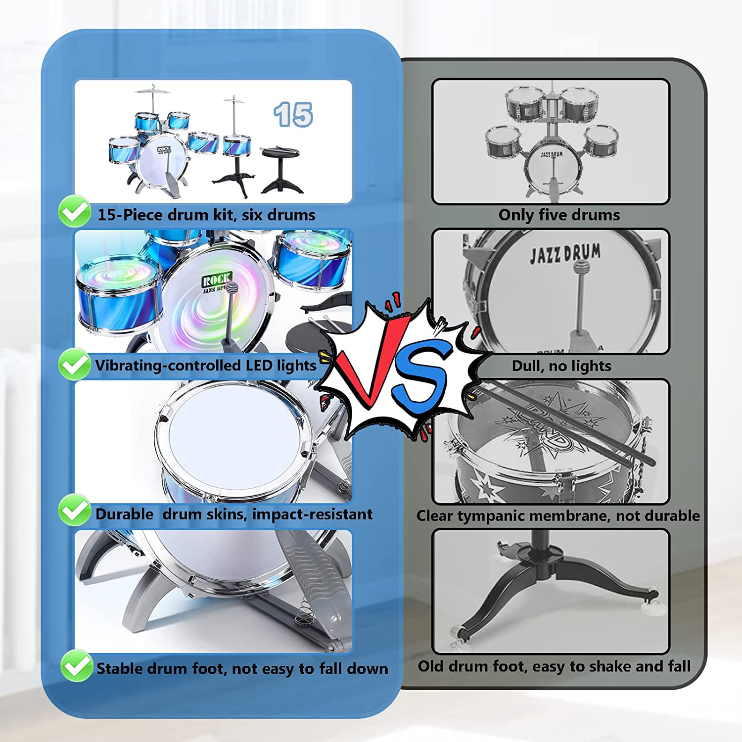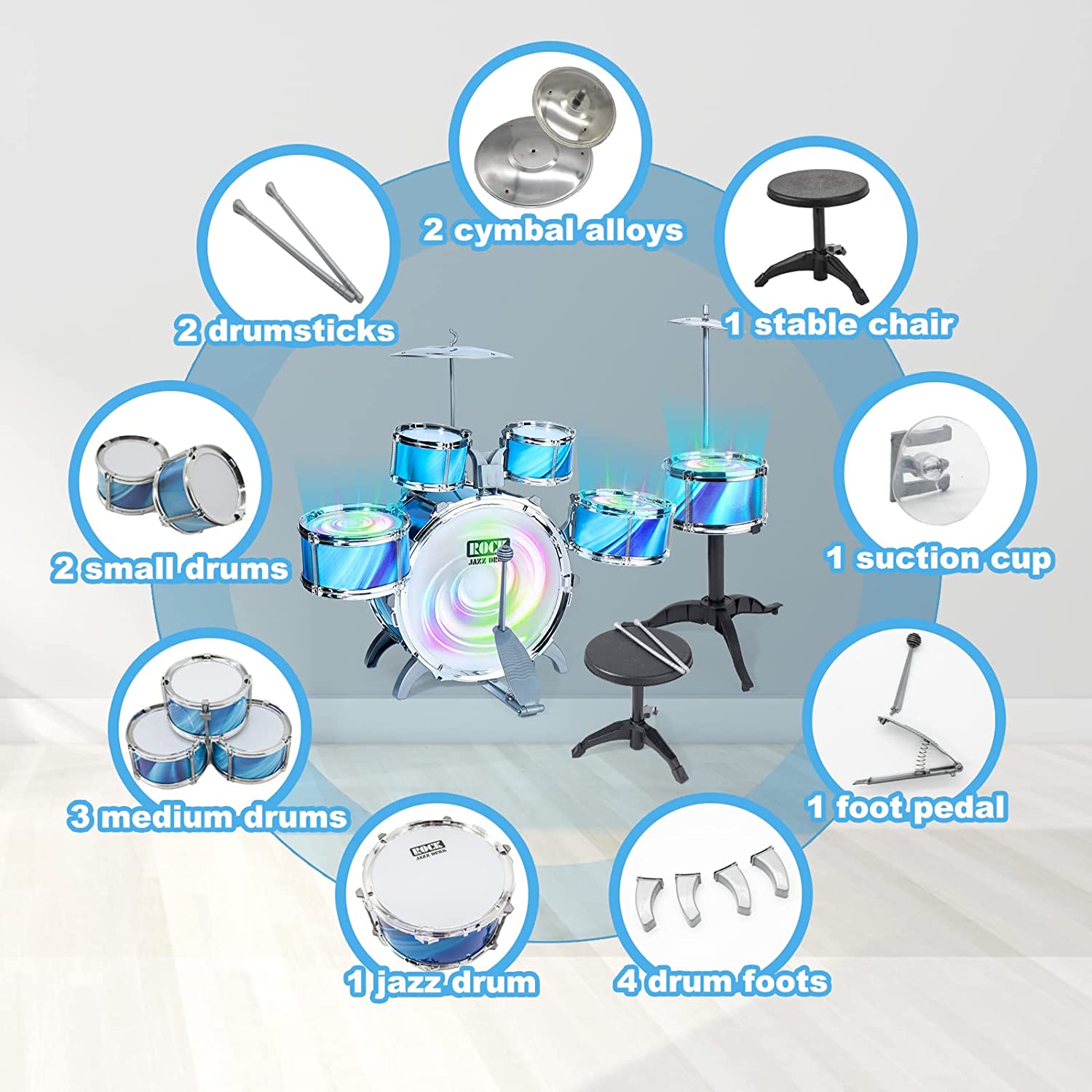 Kids Jazz Drum Set for Toddlers 1-3 (15-Piece), Drum Kit Musical Instrument for Beginner Music Practice w/ 4 Lights, 6 Drums, 2 Cymbals, 2 Drumsticks, Stool (Blue)