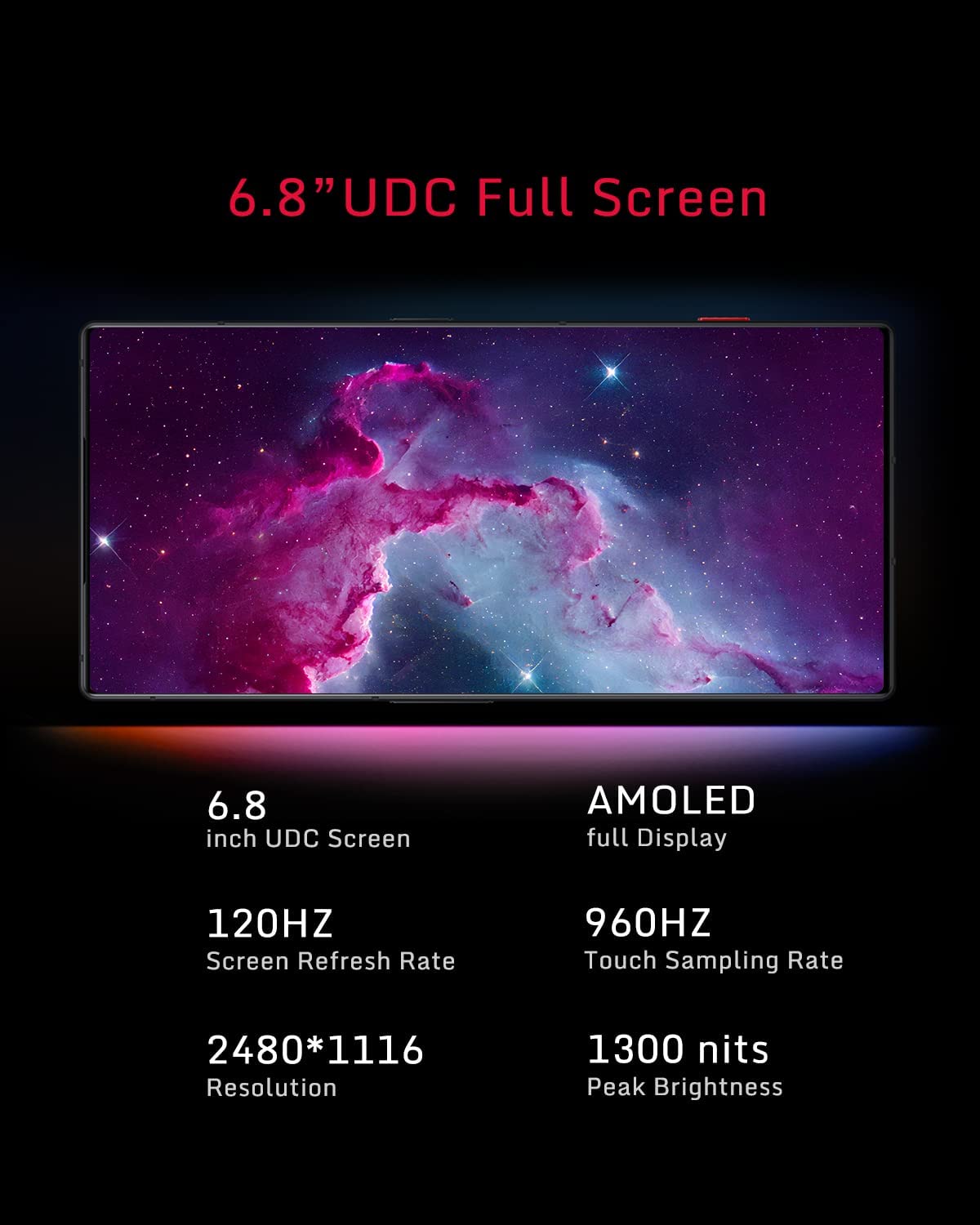 【6.8" FHD Full Screen】Gaming Phone with a 120Hz refresh rate, this 6.8" FHD Full AMOLED screen delivers beautiful HD+ visuals at up to 120 frames per second. With a 960Hz touch sampling rate for multi fingers, the Cell Phone delivers ultra-fast touch and precise response, giving you a serious competitive edge while gaming. The 5G Smartphone have also Under-display Fingerprint Sensor and 16MP Under Display Camera.