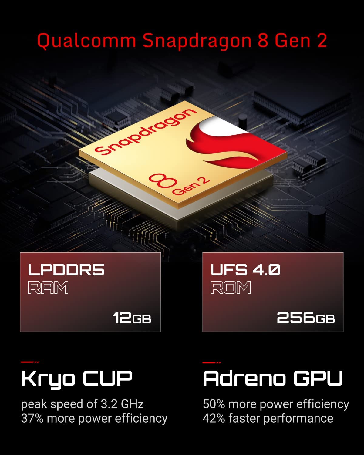 【Latest Chip and Larger Storage】The Gaming Smartphone has the latest Qualcomm Snapdragon 8 Gen 2 (UFS 4.0 + LPDDR5X). Play your favorite games with ease with the raw power of the new CPU clocking in at nearly 3.2GHz and enjoy Triple-A graphics thanks to the fast rendering power of the GPU. 12GB RAM + 256GB ROM provides not only a fun gaming experience and effects, also large storage space for game downloads.