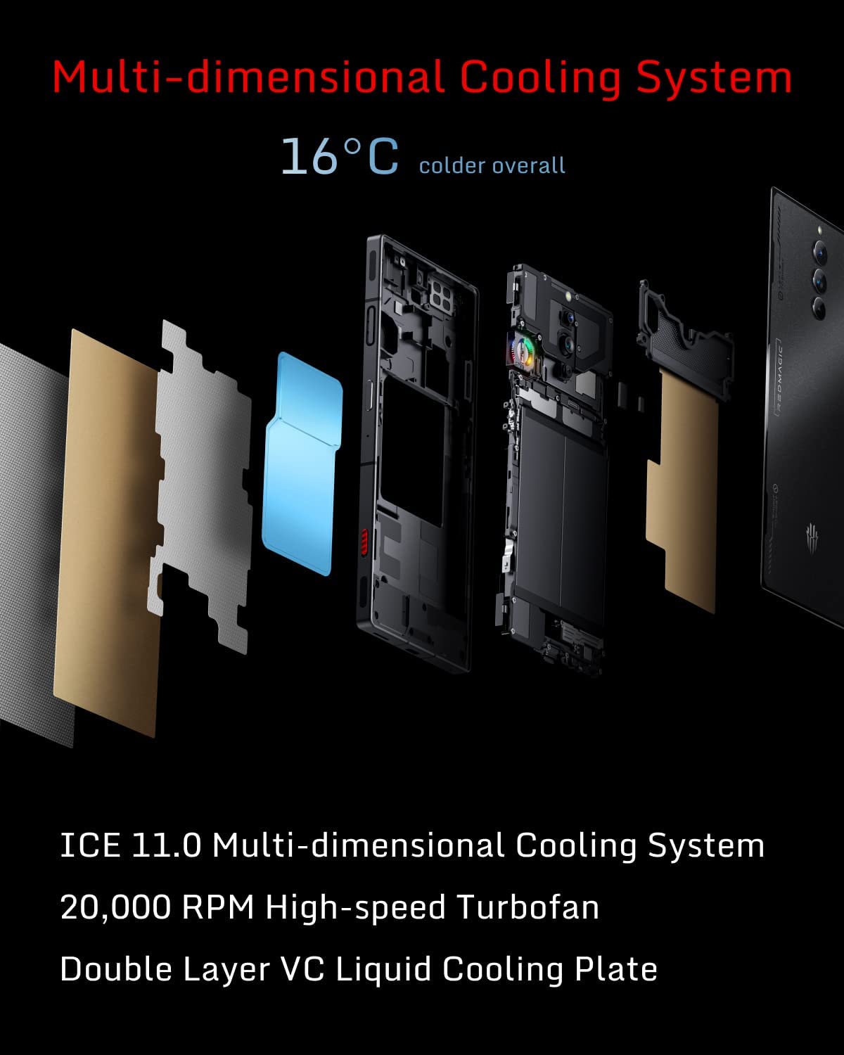 【Multi-Dimensional Cooling System】The Gaming Phone incorporates new aerospace-grade phase change materials (PCM) . Heat can be stored inside this material and released slowly so you feel less heat from the phone while playing, making it more comfortable to hold the phone. The High-Speed Built-In Turbofan accelerates heat dissipation and the fan noise is as quiet as a whisper.