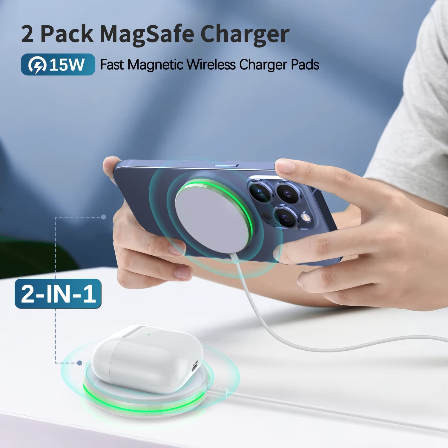 - ?【Mag-Safe Charger Designed for iPhone 12/13/14 Series】The 2-pack magnetic wireless charger provides fast charging for your device up to 15W. Mag safe wireless charging pads are perfectly compatible with iPhone 14/14 Pro/14 Pro Max, iPhone 13/13 Pro/13 Pro Max/13 mini, iPhone 12/ iPhone 12 Pro/ iPhone 12 mini /12 Pro Max, as well as AirPods Pro /3 and 2 models and iPhone models with Mag-Safe cases. ✅Note: Compatible with Mag-Safe phone cases ONLY, but not for other phone cases.