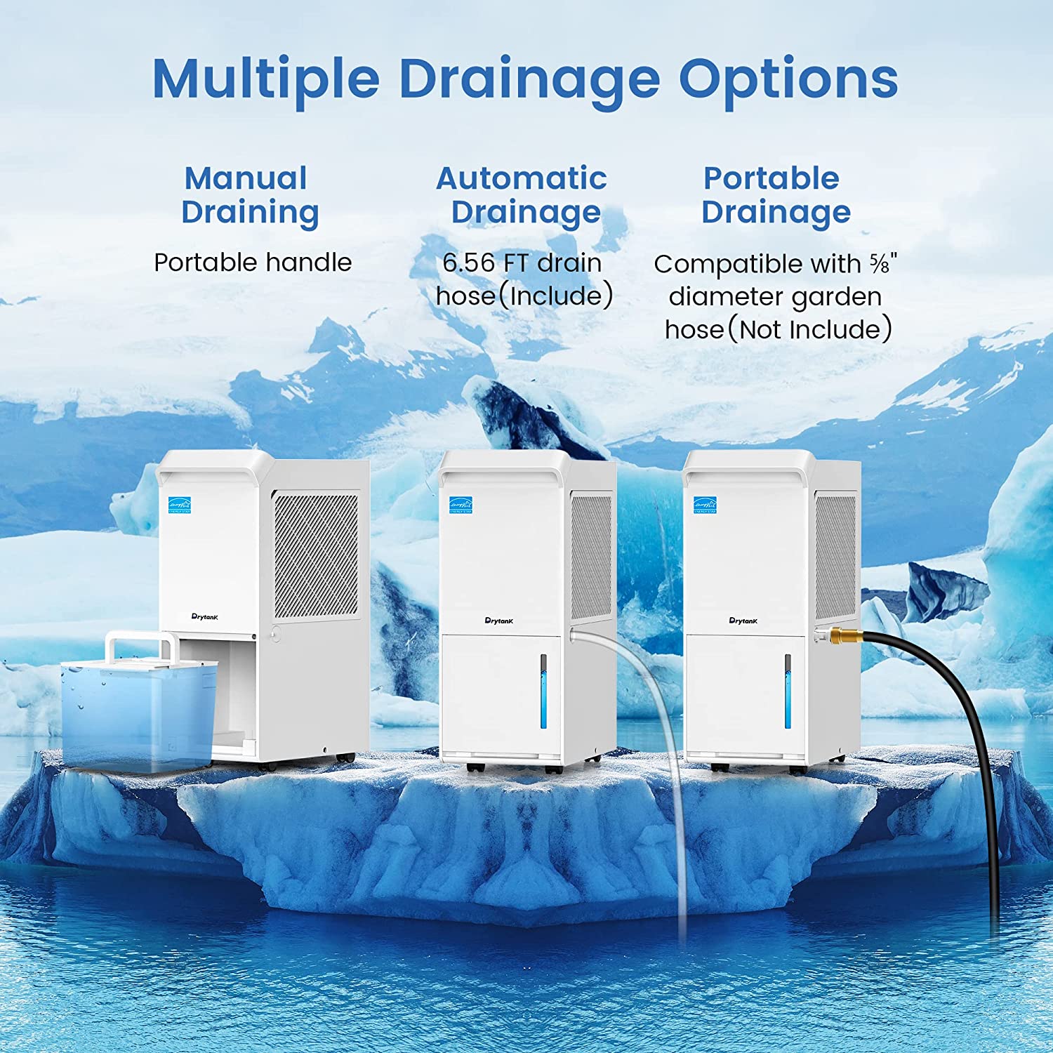 - MULTIPLE DRAINAGE OPTIONS WITHOUT HASSLE: 3 flexible drainage options perfectly meet both of manual and continuous drainage needs. 6.56-foot drain hose included for 7/24 reliable water removal. Compatible with garden hose with an internal threaded end ( NOT included)