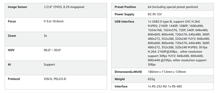 - 3X optical zoom ultra HD conference camera 4K with maximum field of view of 90 degrees (FOV) to meet the needs of small and medium-sized conference rooms.