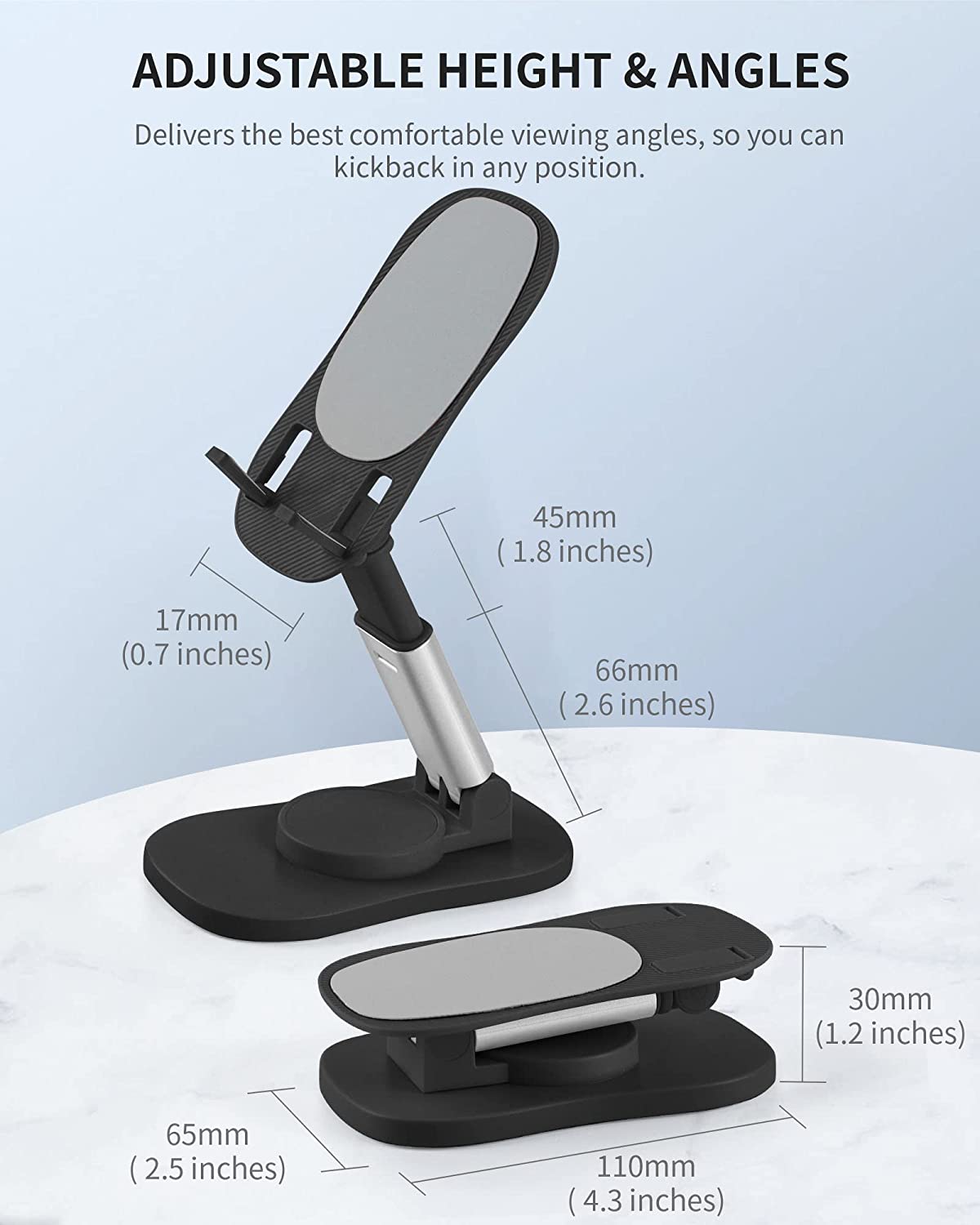 HANDS-FREE ENTERTAINMENT - Having this desktop phone holder to prop up your phone and adjust it to the ideal position, you can free your hands while watching videos, making phone calls, using Facetime, and viewing recipes. Plays a good role in your office, kitchen, nightstand, or dining table.