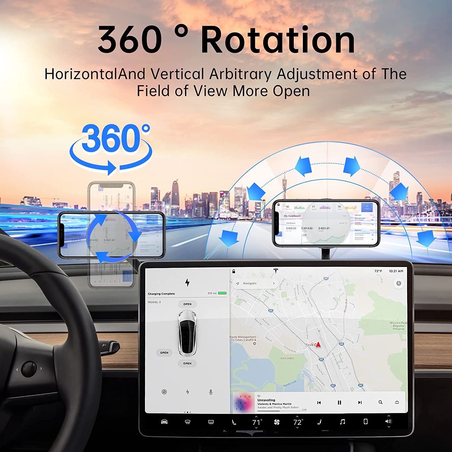 【More Mounting Options】This tesla iphone mount for tesla model 3 accessories and tesla model y accessories, Easy to rotate, Fold and hide, Horizontal and vertical adjustment, Fully adjustable design, 360-degree rotation, Suitable for your multi-angle use, And can be installed on the steering wheel/dashboard Multiple locations behind the panel/center console without obstructing the line of sight for safer navigation.
