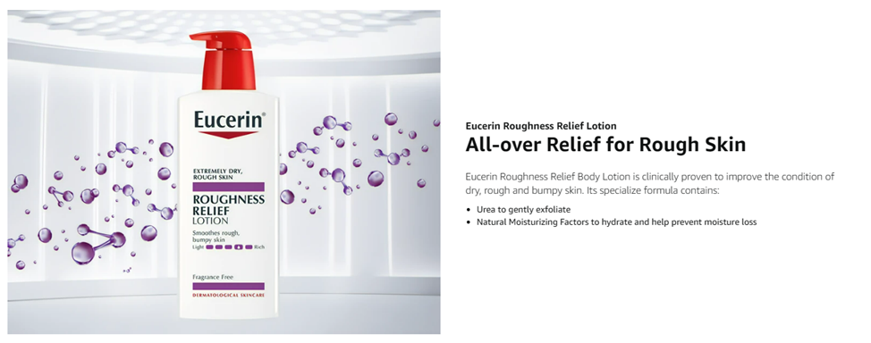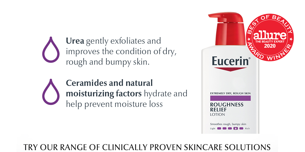 Eucerin Roughness Relief Body Lotion provides 48 hours of hydration and helps smooth rough and bumpy skin. This unique lotion reduces the appearance of bumps with a specialized formula that is enriched with Urea. The formula in this lotion for rough and bumpy skin gently exfoliates and improves the condition of dry, rough and bumpy skin. This rich Eucerin body lotion for dry skin also contains Natural Moisturizing Factors, amino acids naturally found in the skin, and hydrates and helps to prevent dryness. Eucerin Roughness Relief Lotion is fragrance free, dye free, and safe to use on sensitive skin. This body moisturizer is perfect to use as a lotion for very dry skin, and can also be used as a hand lotion or foot lotion. To use, smooth this dry skin lotion over skin daily. For targeted treatment of rough, scaly spots, try Eucerin Roughness Relief Spot Treatment. Eucerin is a dermatologist-recommended skincare brand that is based on an uncompromising approach to science. With skin care products designed to restore and sustain healthy-looking skin, families everywhere look to Eucerin to enhance outer beauty and self-confidence.
