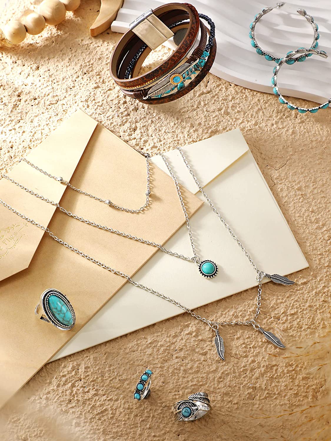 Package Includes: the package will come with 6 pieces of turquoise jewelry for women, including a piece of turquoise faux leather layered bracelet, a pair of turquoise dangle earrings, a piece of turquoise pendant necklace and 3 pieces of turquoise finger rings, good collocation to meet your wearing, matching and replacement needs