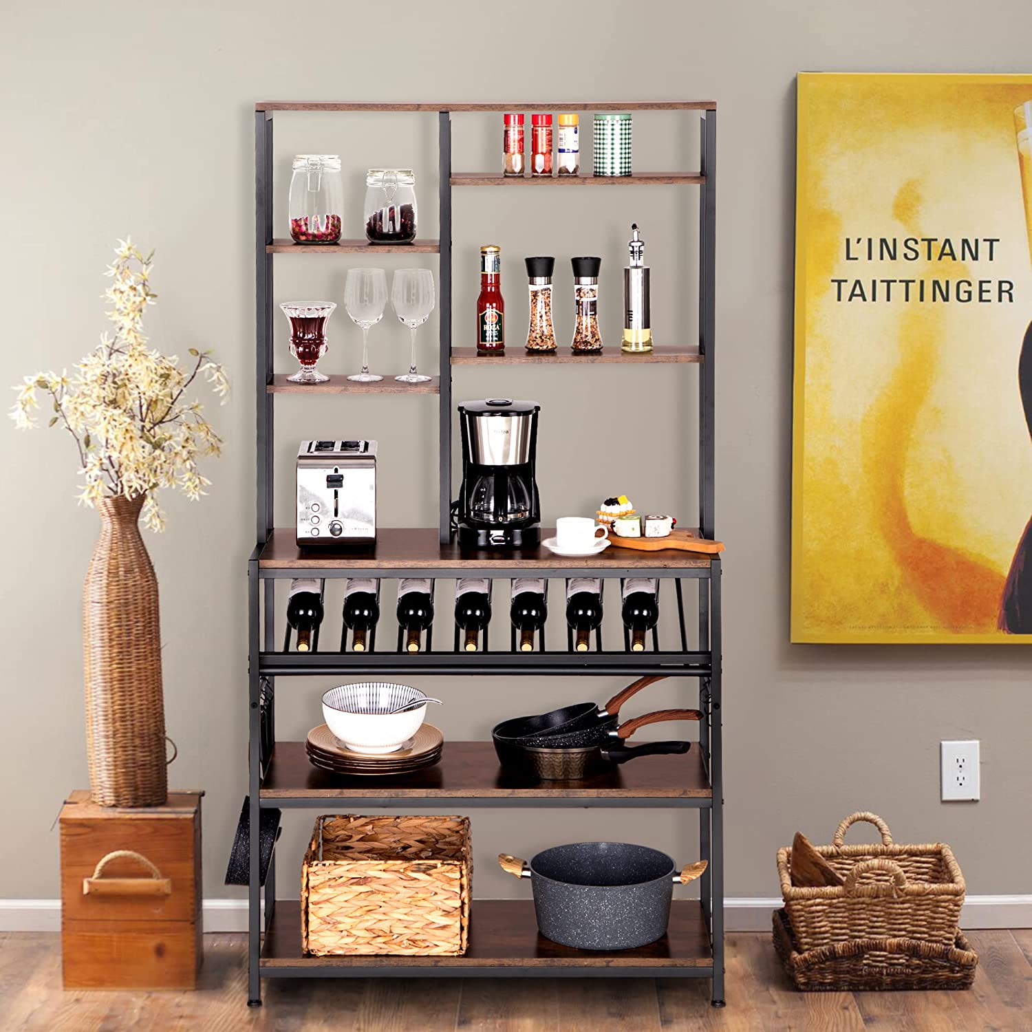 MAISON ARTS Bakers Racks for Kitchens with Storage, Microwave Stand Coffee Bar Station with 6 Hooks Wine Storage, Industrial Kitchen Shelf, Rustic Brown