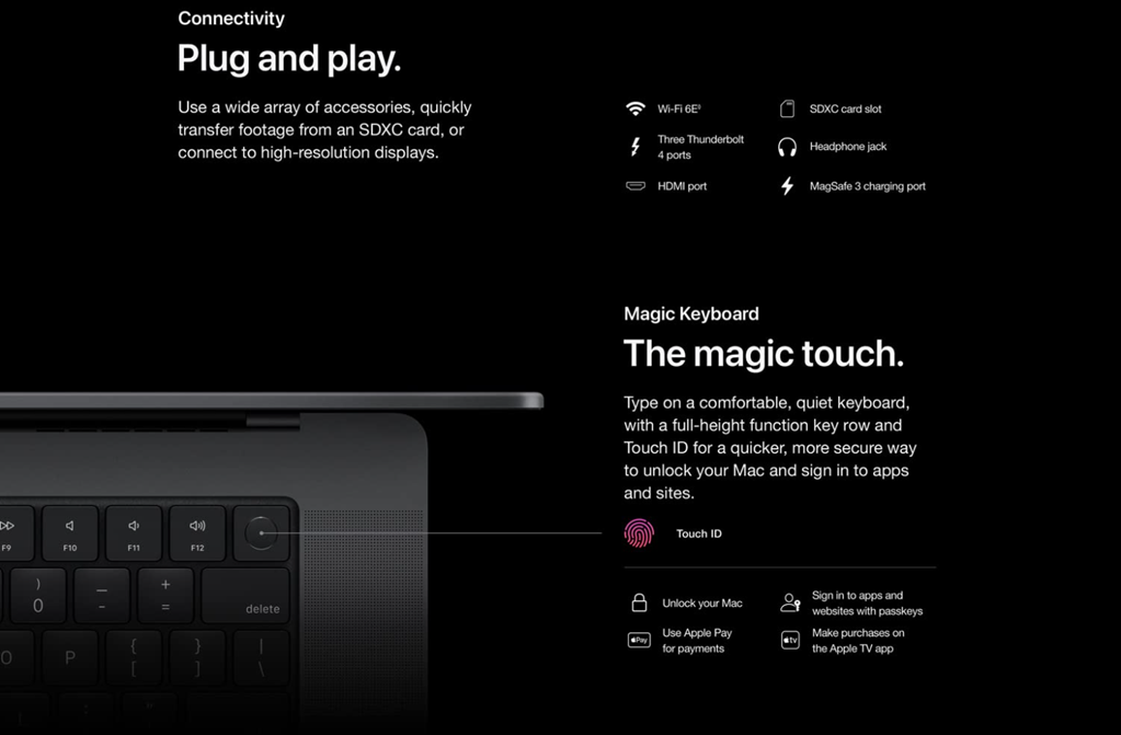 | Charging and Expansion | Three Thunderbolt 4 (USB-C) ports with support for: Charging, DisplayPort, Thunderbolt 4 (up to 40Gb/s), USB 4 (up to 40Gb/s); SDXC card slot, HDMI port, 3.5 mm headphone jack, MagSafe 3 port |