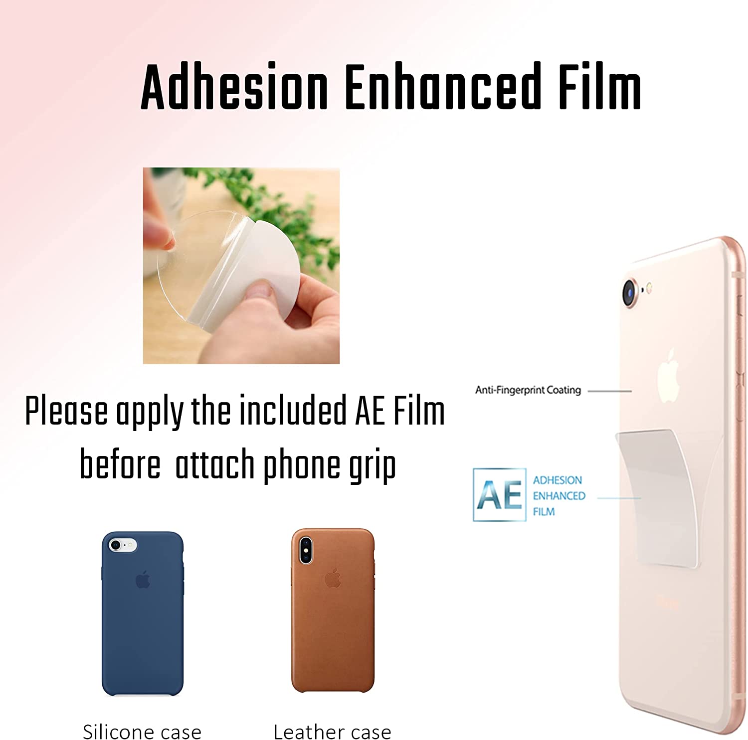 DIRECTIONS:✔️Apply tightly to the back of your clean, dry phone or tablet✔️Make sure the Grip is not covering your camera lens before applying✔️If the adhesion is too weak, please apply the enclosed Adhesion Enhanced Film first, and then attach the phone grip
