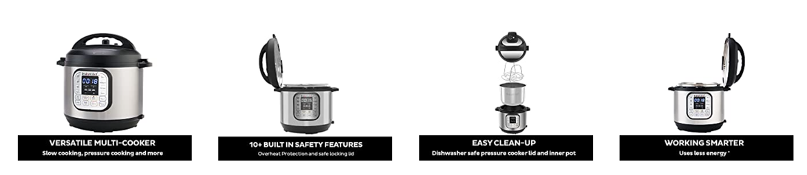 Easy to use, easy to clean, fast, versatile, and convenient, the Instant Pot® Duo™ is the one that started it all. It replaces 7 kitchen appliances: pressure cooker, slow cooker, rice cooker, steamer, sauté pan, yogurt maker & warmer. With 13 built-in smart programs, cook your favorite dishes with the press of a button. The tri-ply, stainless steel inner pot offers quick, even heating performance. Redefine cooking and enjoy quick and easy meals anywhere, any time. The Instant Pot Duo offers the quality, convenience and versatility you’ve come to expect from Instant – discover amazing. Worry-free cooking Smart Program timed cooking pre-sets let you “set it and forget it,” freeing you to do other things while the Duo cooks your dinner safely and quickly, with minimal mess and easy clean up.