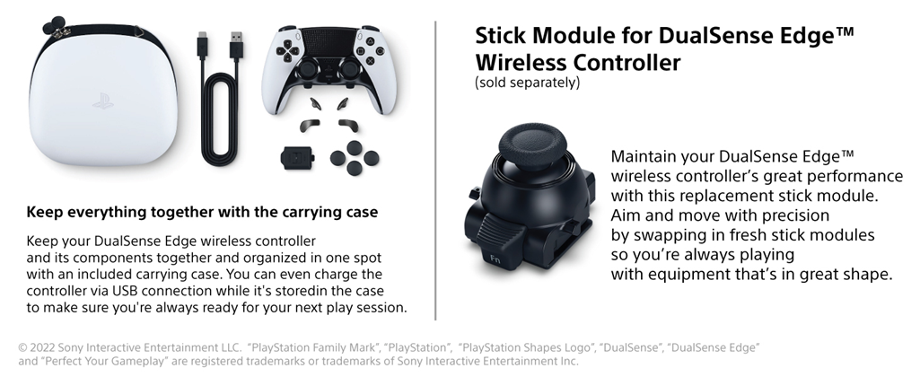 Get an edge in gameplay by creating your own custom controls to fit your playstyle. Built with high performance and personalization in mind, the DualSense Edge™ wireless controller invites you to craft your own unique gaming experience so you can play your way. Ultra-Customizable Controls: Changeable stick caps, remappable inputs and custom settings make your DualSense Edge™ wireless controller uniquely yours. Fine tune your aim by adjusting stick sensitivity and dead zones, set the travel distance of your triggers for faster inputs, and quickly swap between control profiles so you’re always ready for your next game. Mappable Back Buttons: Swappable back buttons can be configured to any other button input, so you’ve always got game-changing actions and essential controls at your fingertips. Plus, with two different styles of button to choose from, you can pick an input type that feels just right for your playstyle. DualSense™ Wireless Controller Features Built In: Enjoy all the immersive features of the DualSense™ wireless controller and our signature controller comfort. Experience varying force and tension at your fingertips with adaptive triggers and feel your in-game actions and environment simulated through haptic feedback. Replaceable Stick Modules: Play for longer with swappable replacement stick modules available to purchase separately. Haptic feedback and adaptive trigger features available when supported by game.
