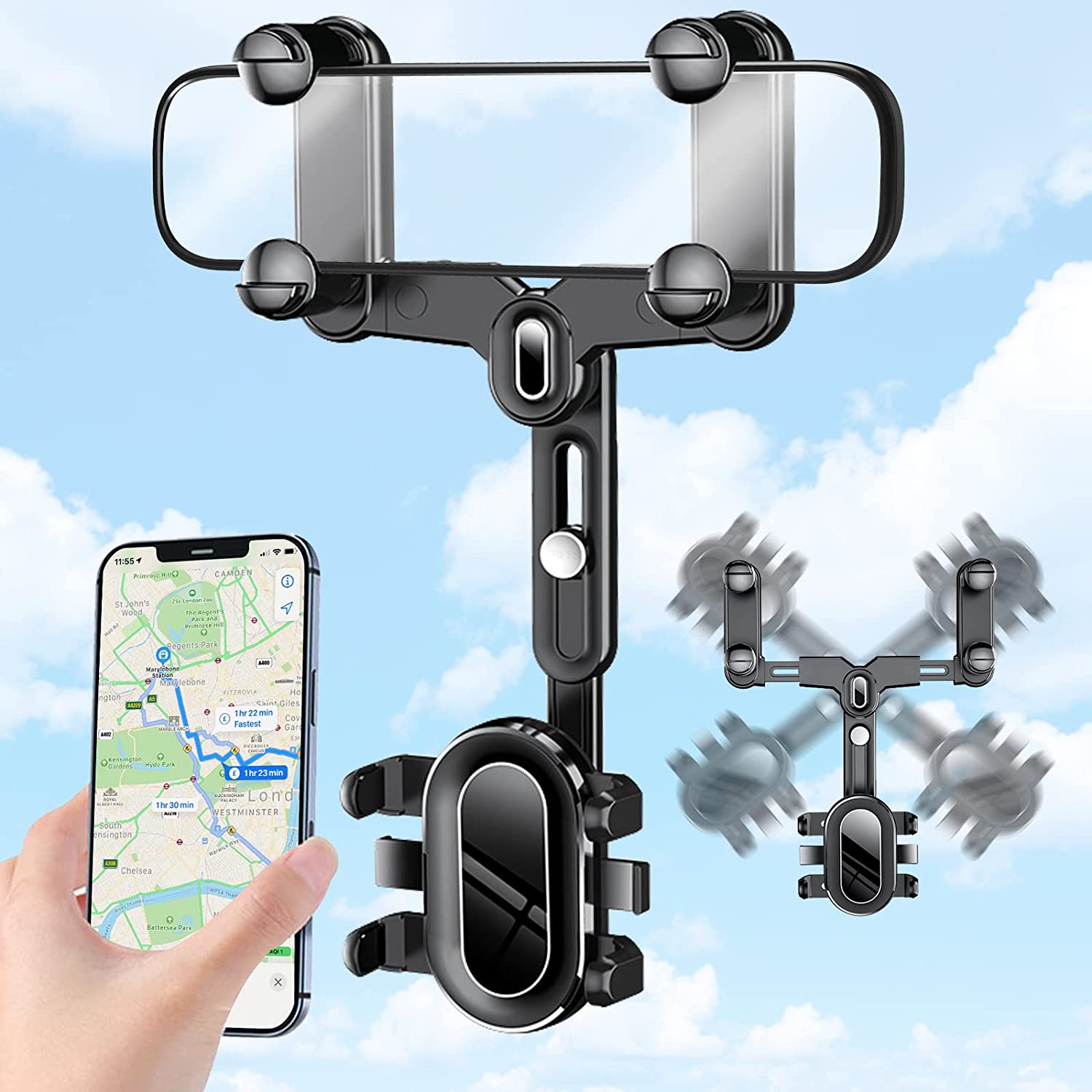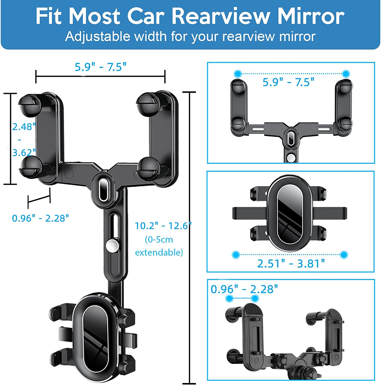 ?Rotatable and Retractable Car Phone Holder - The multifunctional car rearview mirror phone holder with 360° rotation design, you can put your phone in any direction (horizontal, vertical and more) as you like to enjoy the best driving experience. The arm length can be telescoped 0-5cm without obstructing your vision and ensure a safer travel for you and your family.