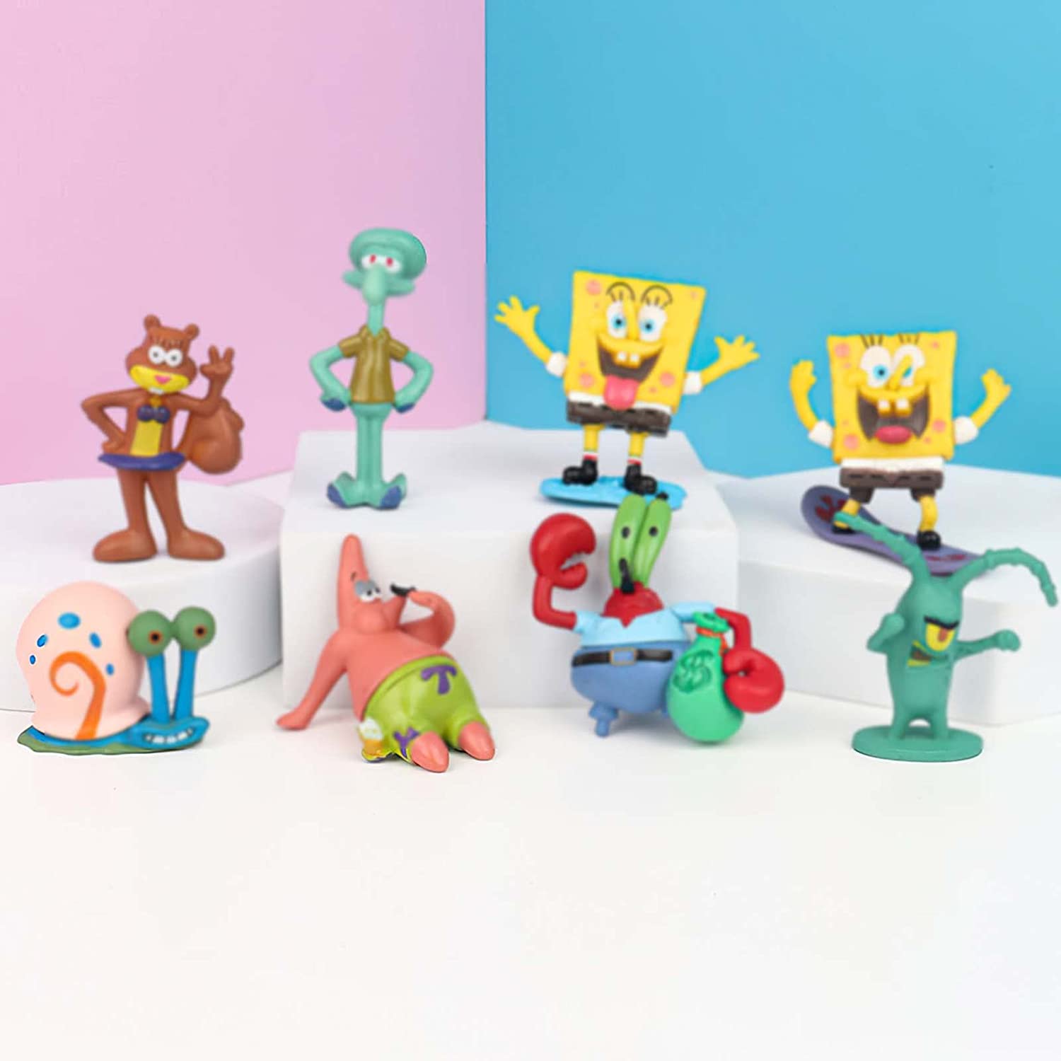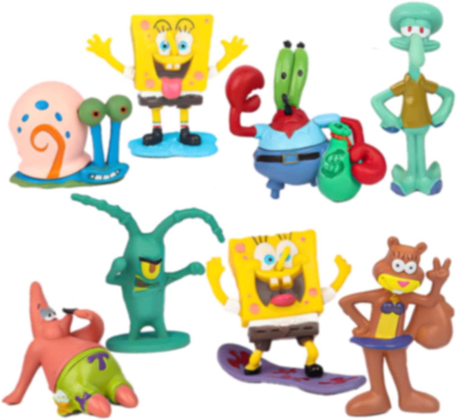 8 piece figurine playset with characters from the hit tv show... Spongebob Squarepants! These are great for cake toppers to decorate a cake, to give as birthday party favors, or to use as toys to play with! These are genuine toys. No retail box or retail packaging. All characters are individually wrapped in clear bags and sealed together in a clear OPP/CPP bag. Toys may have slight imperfections but doesn't affect overall appearance. We will ship in a box to ensure safe delivery! SUPER CUTE!! This Set includes: Spongebob - 2 inches Spondebob (surfing) - 2 inches Patrick Star - 1.5 inches Squidward - 2.5 inches Mr. Krabs - 2.25 inches Sandy Cheeks - 2.25 inches Gary - 1.5 inches Plankton - 2 inches