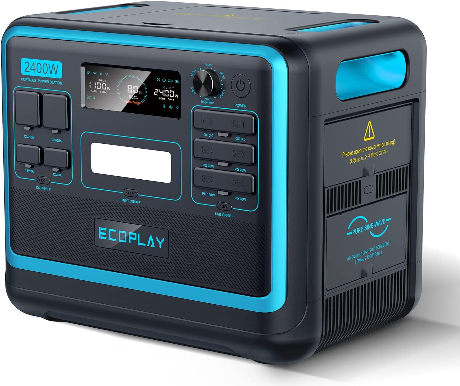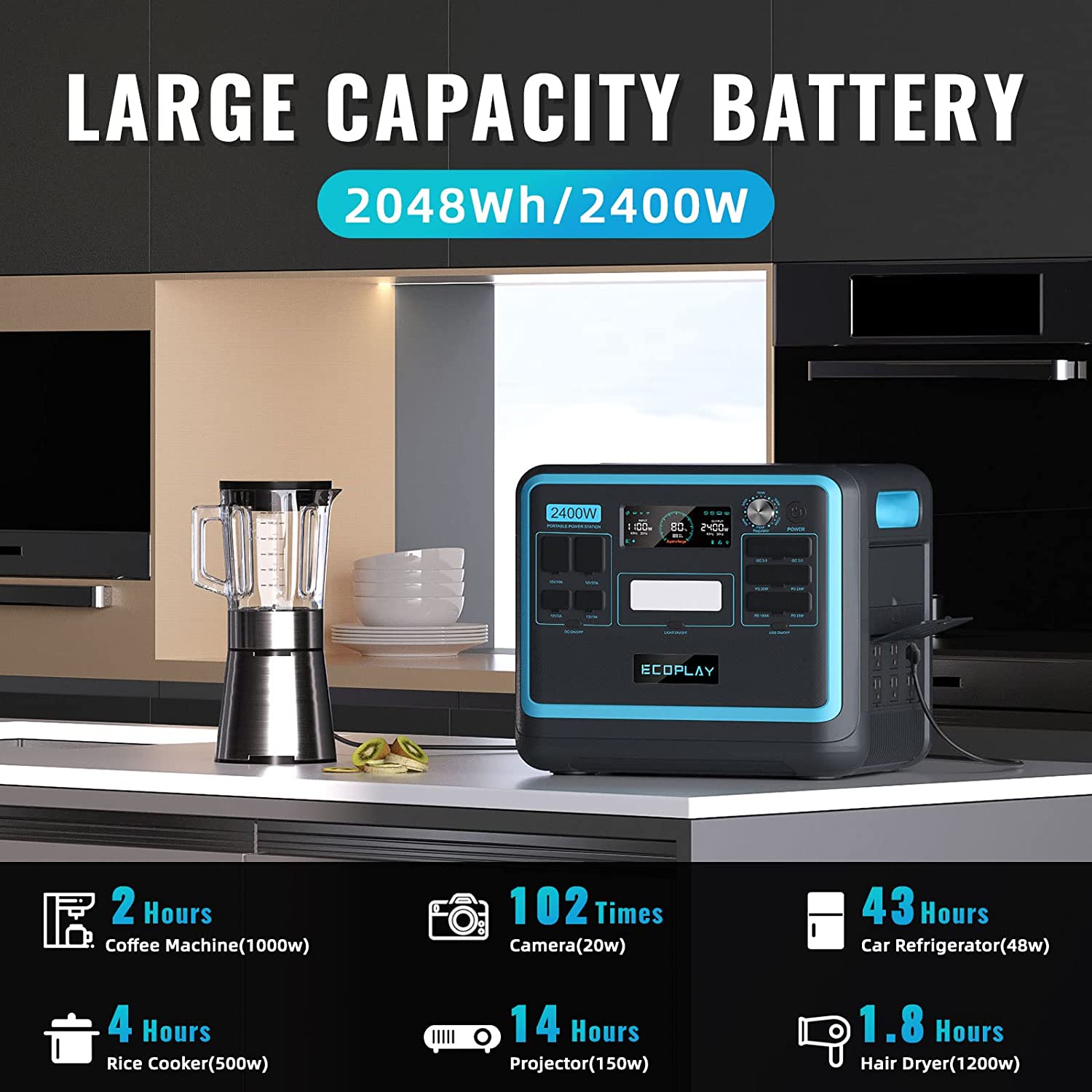 - 【2048WH SUPER LARGE CAPACITY BATTERY】 Our portable power station is equipped with a 2048Wh/640000mAh LiFePO4 battery, which charging for Laptop(50W) 42h,Drone(40W) 52h,Coffee Machine(1000W)2h+,Camera(20W) 95 times, Car Refrigerator(48W)48h,,Projector(150W)14h, Hair Dryer(1200W)2h, Juicer(1000W)2h,Electric Kettle(500W)4h+,Electric Drill(800W)2.5h. Note:The Ecoplay power station is the lightest and safest 2400W portable power station in the market. Weighs only 48 lbs, size:15.1*11.1*12.6 inch.