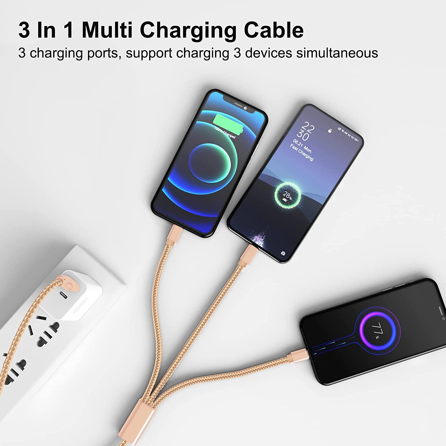 【Portable and Convenient 】 3-in-1 Multi Charging Cables is multifunctional integration design. One universal multi charging cable meets a variety of everyday needs. USB-C & Micro USB Cable universal charger cord support to charge most of the cell phones, this charger cable you can charging multiple devices at the same time instead of taking more cables with you, one cable is enough! Please Note it is ONLY FOR CHARGING NOT FOR SYNCING DATA.