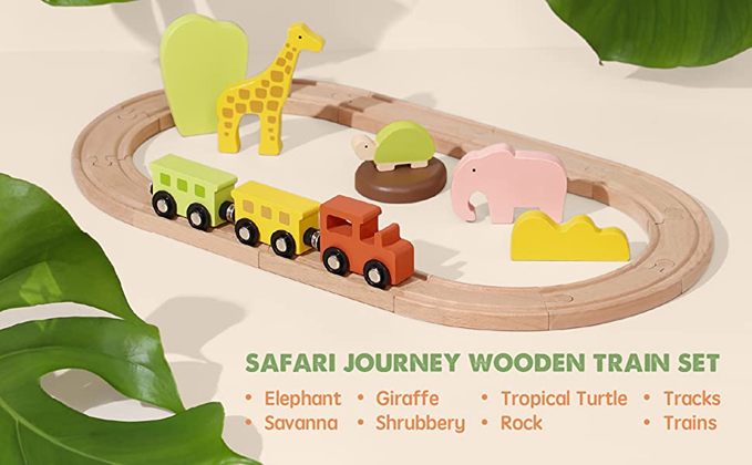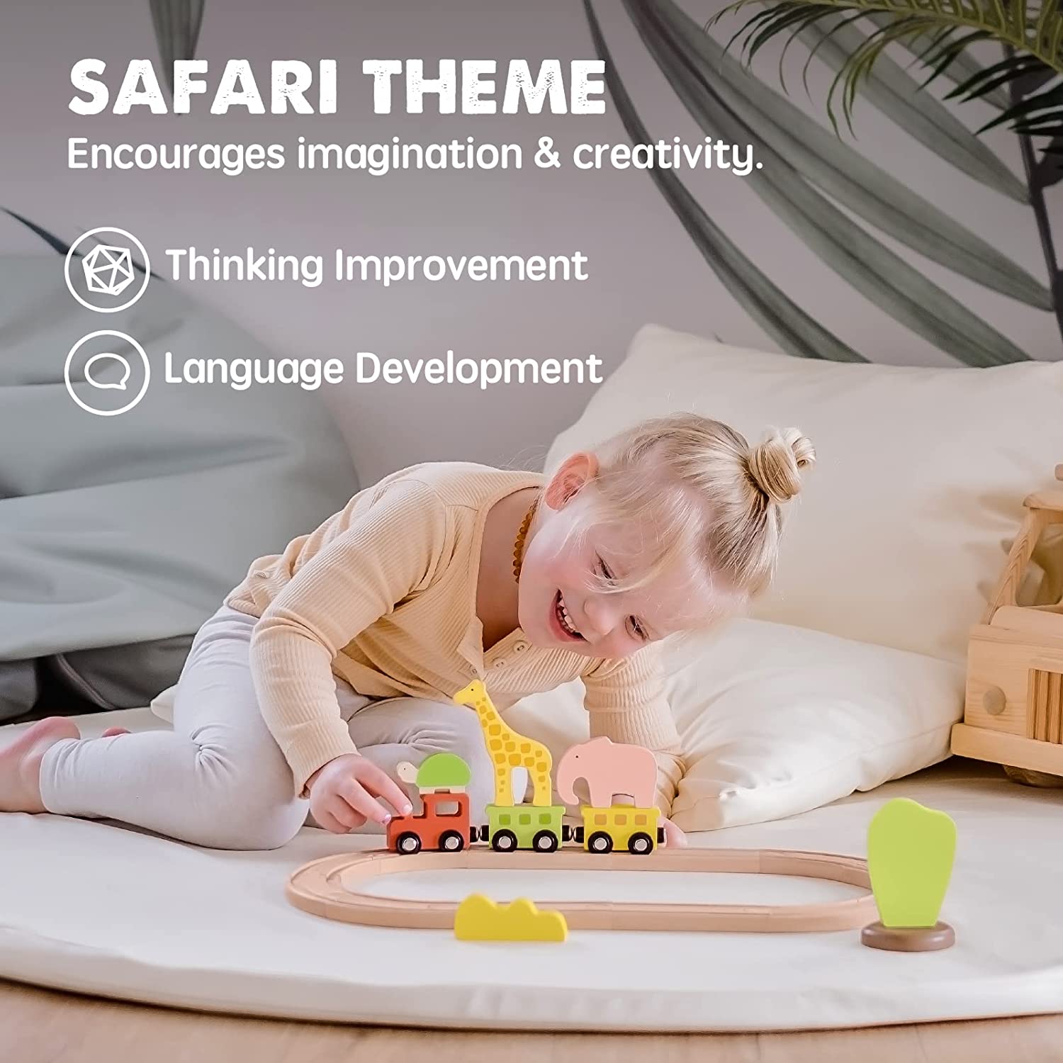 ?Safari Theme Wooden Train Set: Driving your first train and having a wonderful visit to the zoo! Toddlers aged 1-3 can explore different shapes of animals by "traveling" in the zoo. The rhythmic click-clack sound of the toddler toys on the wooden train track leads babies into the world of imagination.
